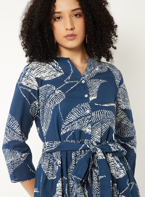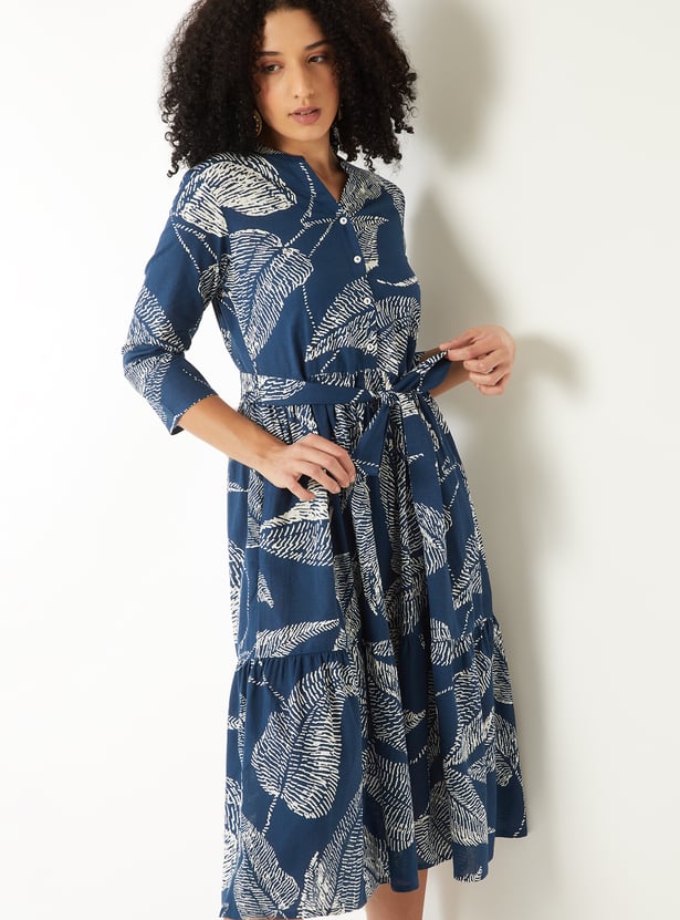 Step out in effortless elegance with this printed midi dress, featuring a chic band collar and flattering belted waistline. Designed with 3/4th sleeves for a refined touch and a practical side pocket for added convenience.