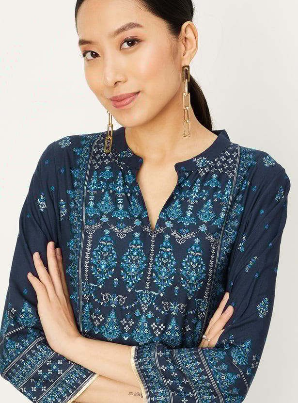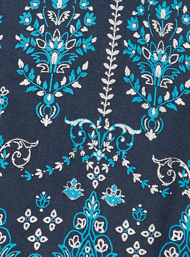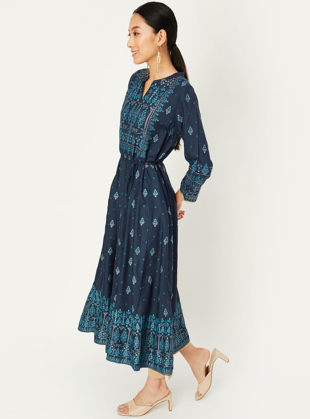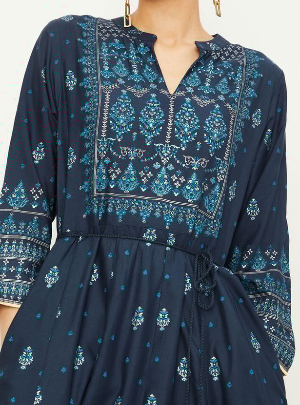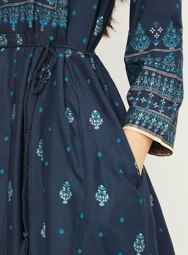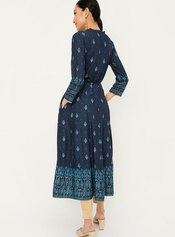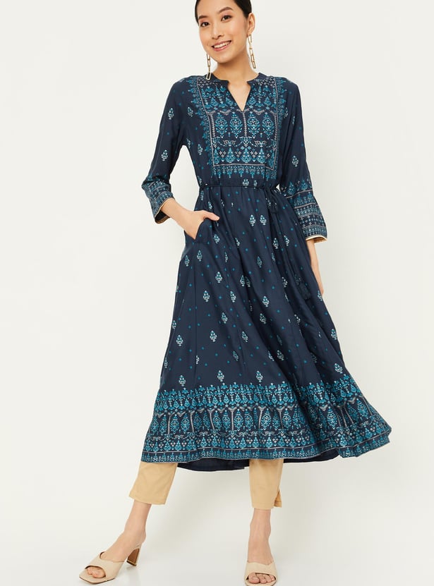 Enhance your festive look with this stylish kurta. It has a notched neck, three-fourth sleeves, side pockets, and a string belt for a cinched fit. The beautiful printed pattern and Anarkali silhouette add a trendy and comfortable touch to your ethnic ensemble.