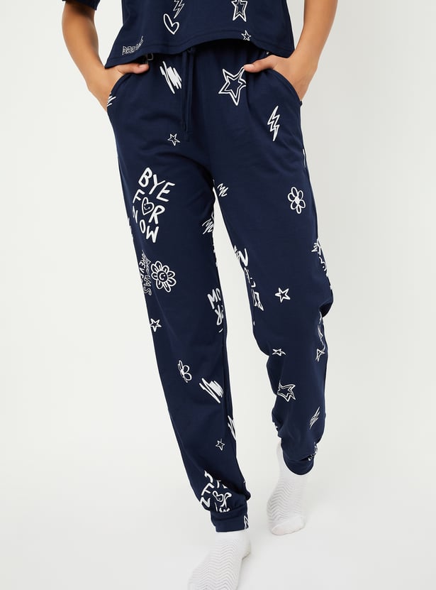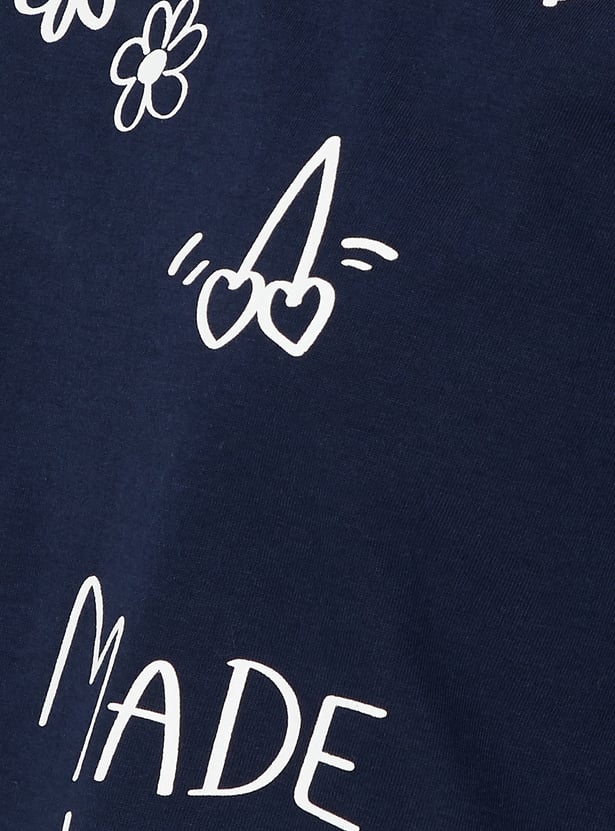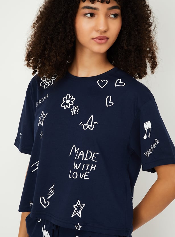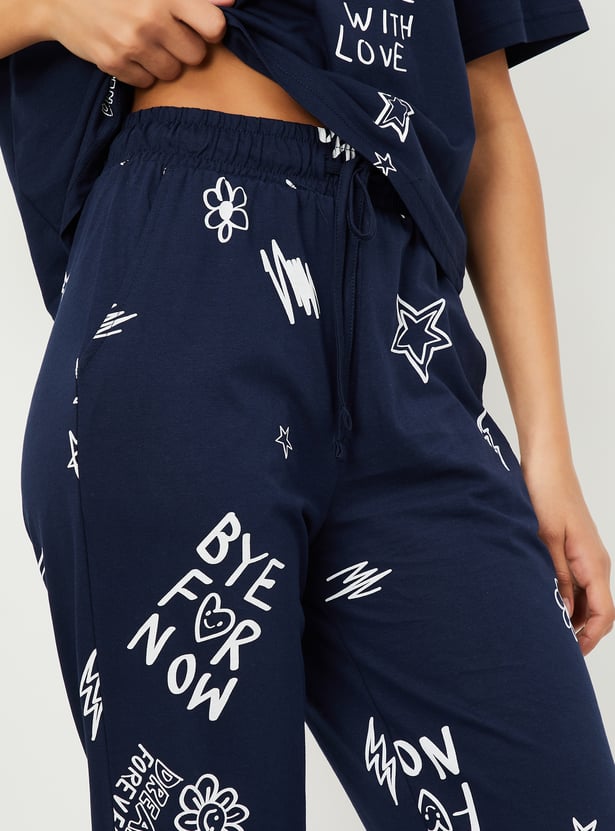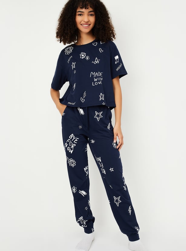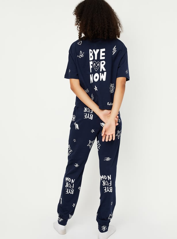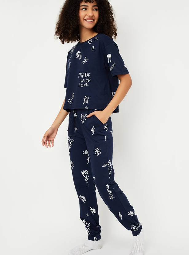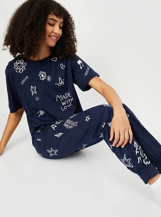 Unwind in style with this printed PJ set. The t-shirt features a comfortable round neck and half sleeves, while the matching pajamas come with an elasticated waist for the perfect fit.
