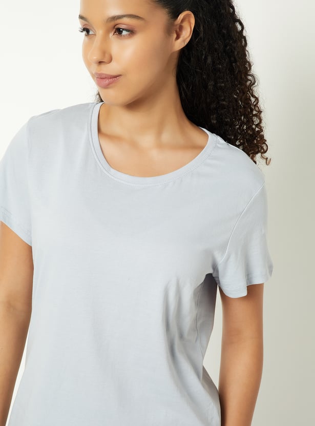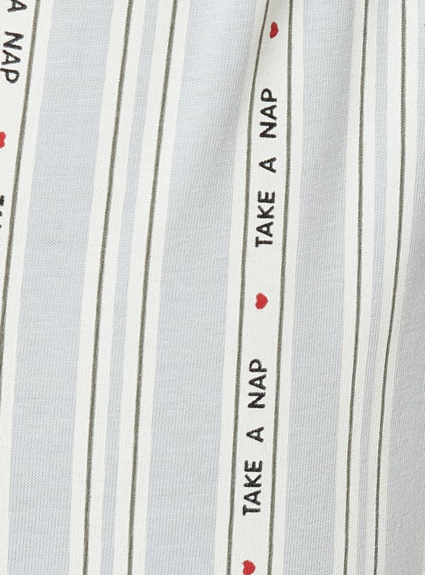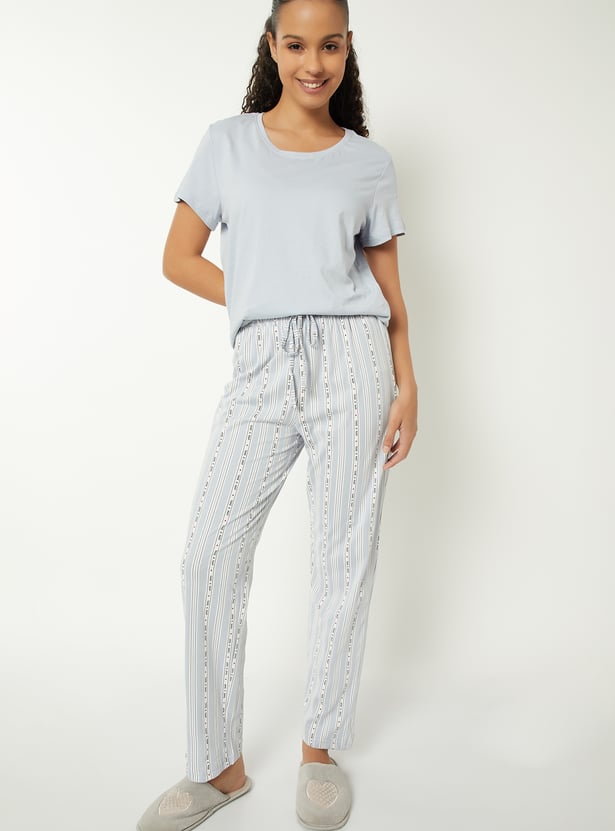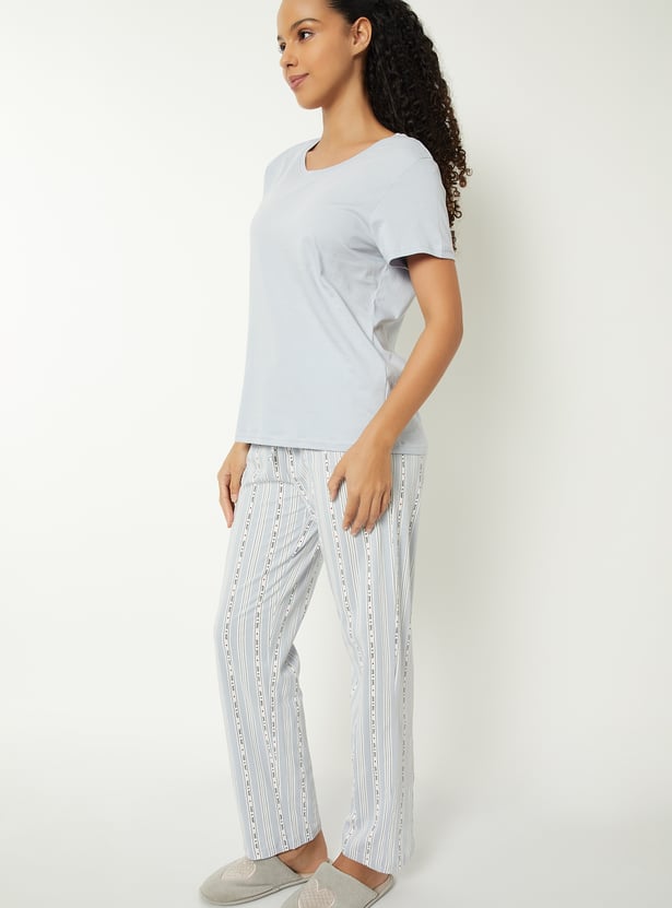 Comfort meets style in this printed PJ set. The solid T-shirt features a classic round neck and half sleeves, while the printed pyjamas come with a drawstring closure. Soft, breathable, and perfect for winding down. Model Size :