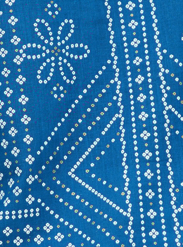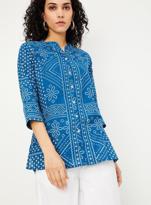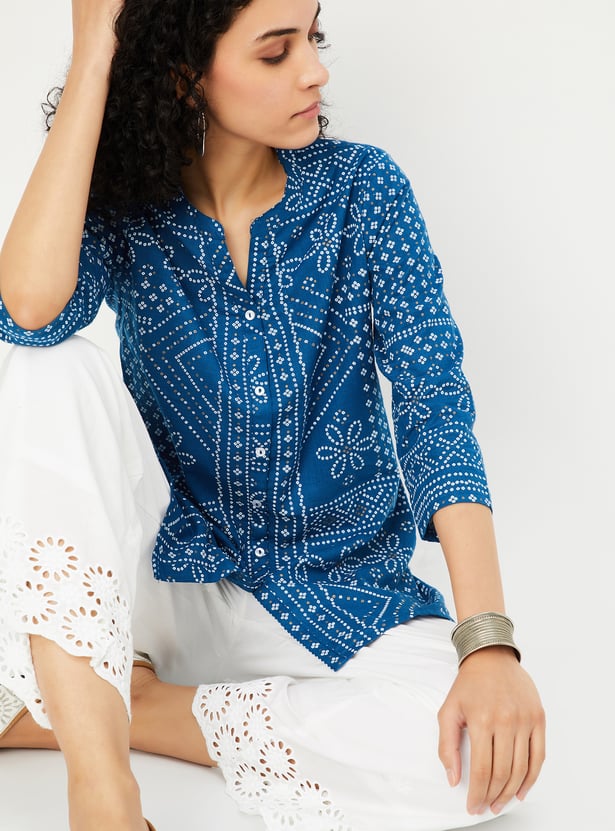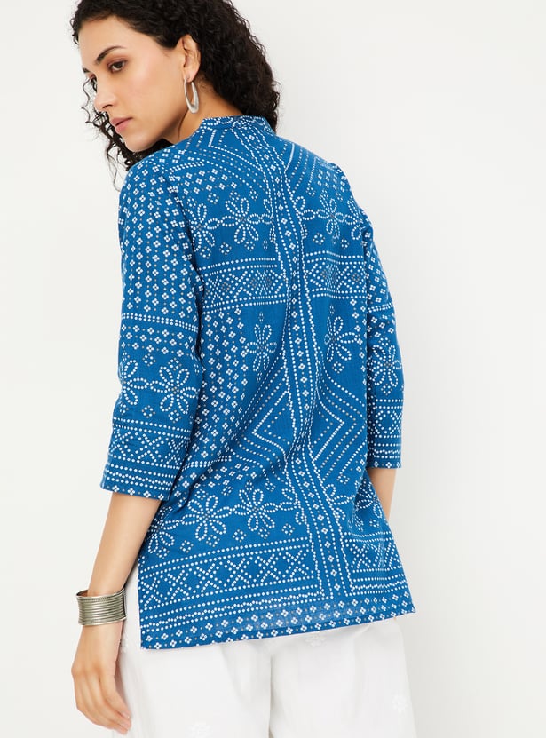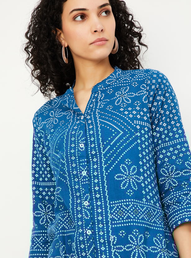 Flaunt your elegance with this printed kurti, featuring a charming design that adds an alluring flair to your look. Crafted with a band collar, three-quarter sleeves, and a front-open design with button closure, this piece is perfect for creating a sophisticated and stylish ensemble.
