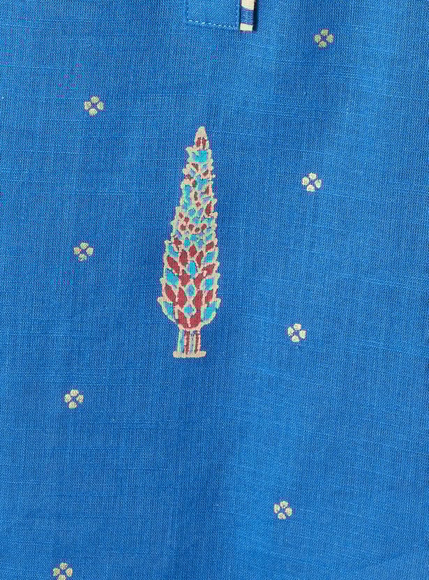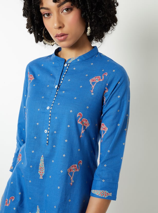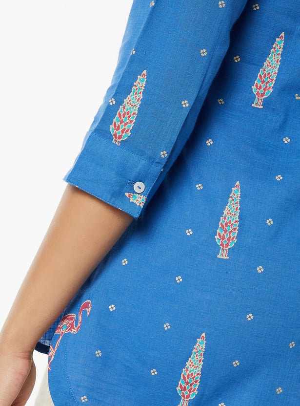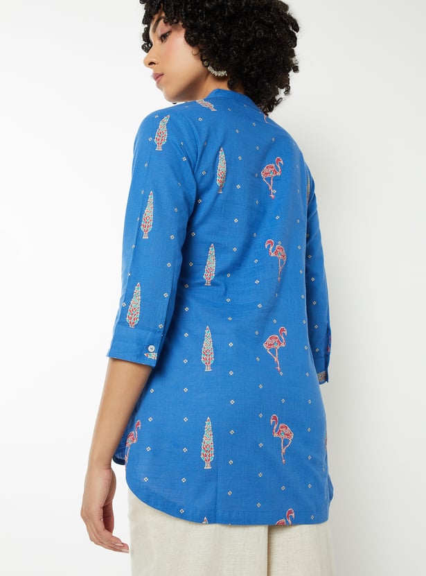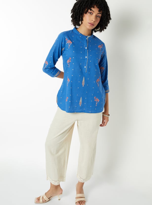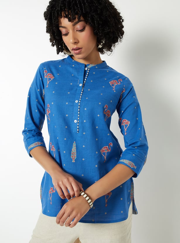 This printed short kurti features a smart band collar and 3/4th sleeves, blending classic charm with modern comfort. Perfect for workdays or casual outings