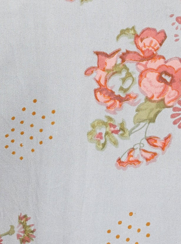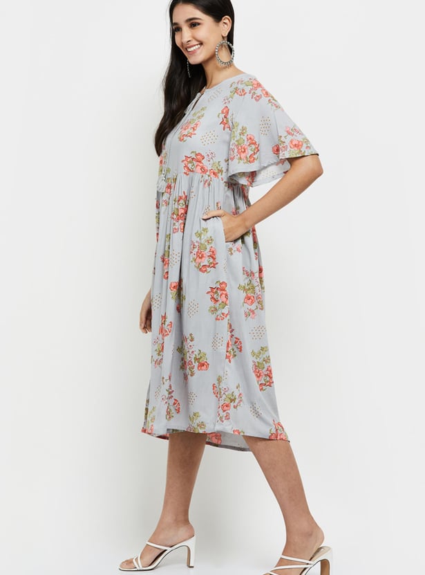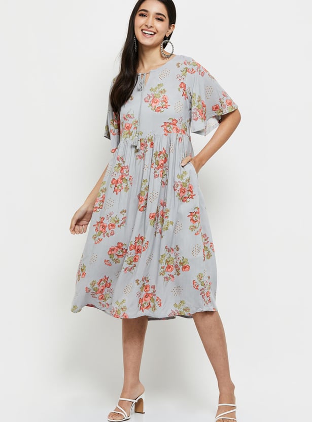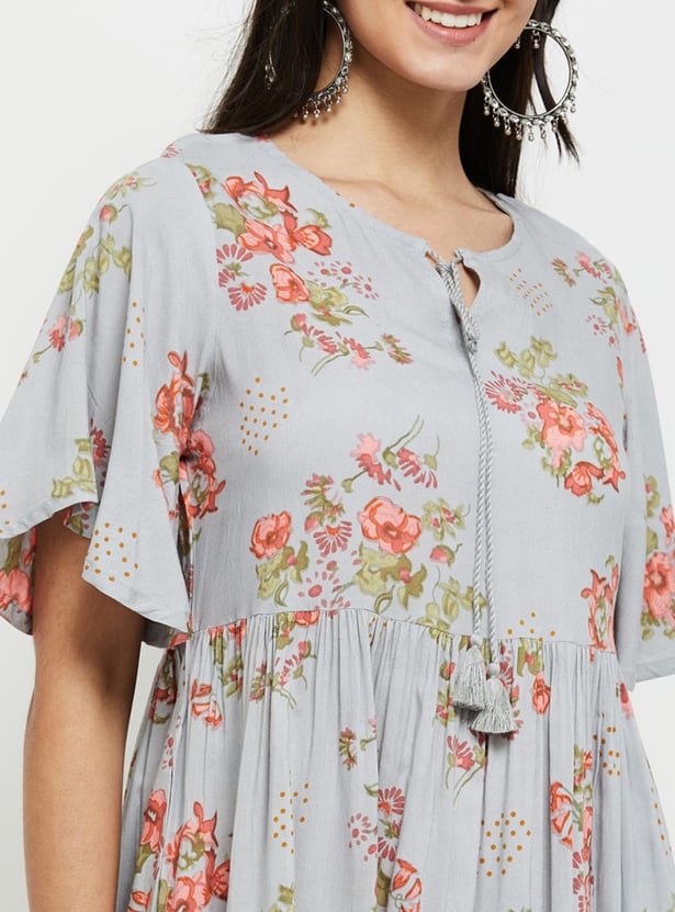 Designed with bold prints, this A-line dress is complemented with a tie-up neckline and flutter sleeves.