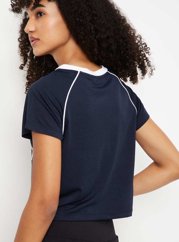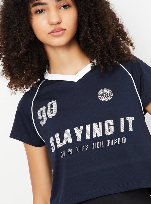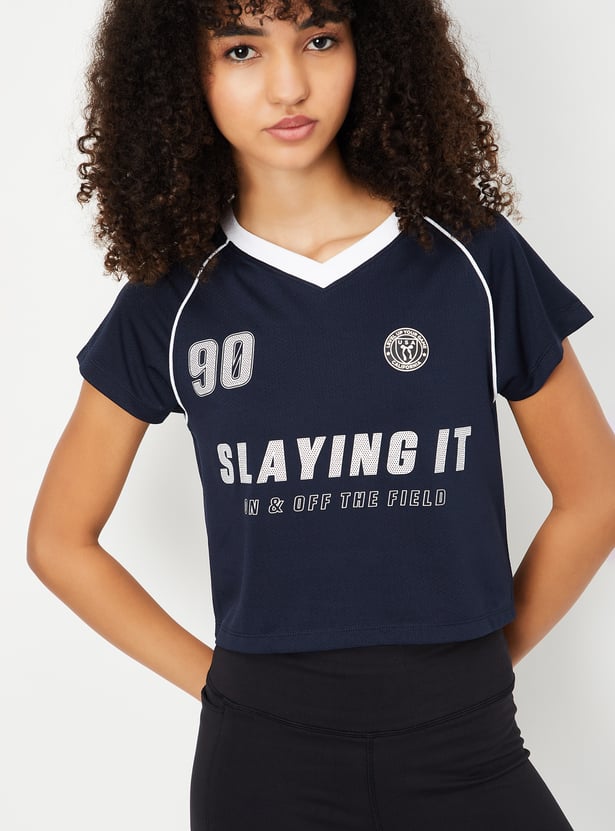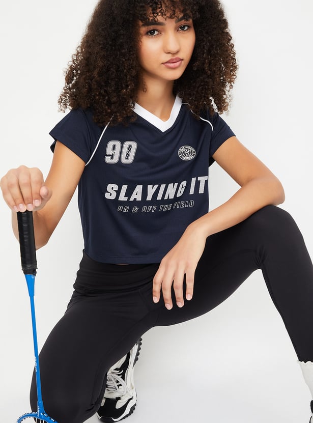 This printed slim fit athleisure T-shirt offers a sporty, flattering look with a crop length, V-neck, and half sleeves. Perfect for active days or casual outings, it combines style and comfort effortlessly.