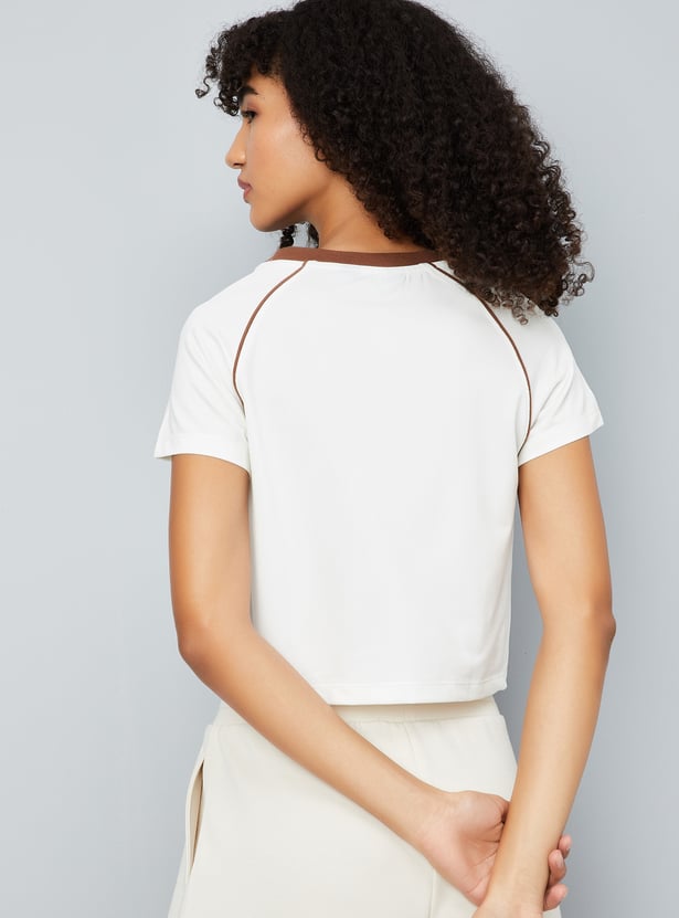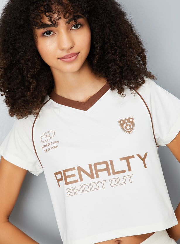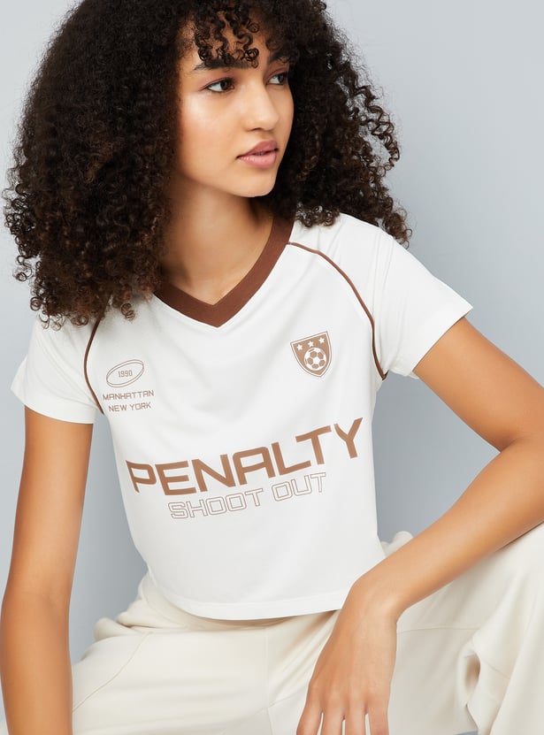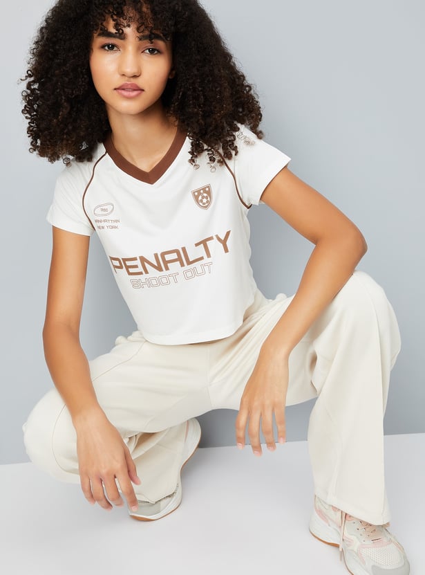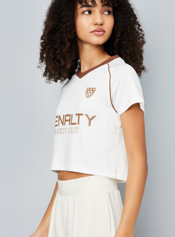 This printed slim fit athleisure T-shirt offers a sporty, flattering look with a crop length, V-neck, and half sleeves. Perfect for active days or casual outings, it combines style and comfort effortlessly.