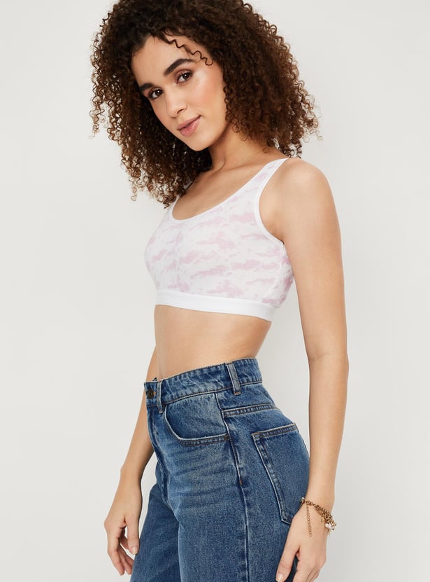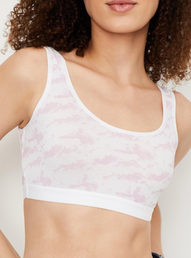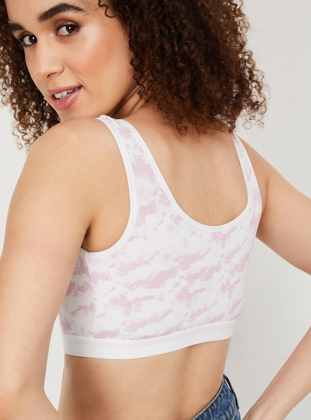 Power through your day in the comfort of this bra. It has abstract prints for added style. This beginner bra has a scoop neck, soft cups, and an elasticated hem.