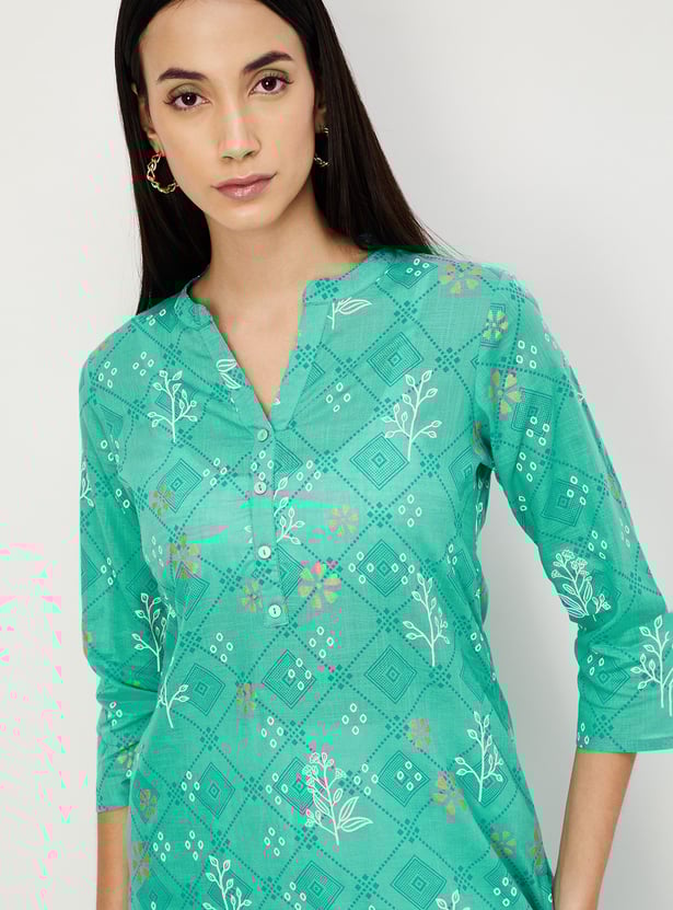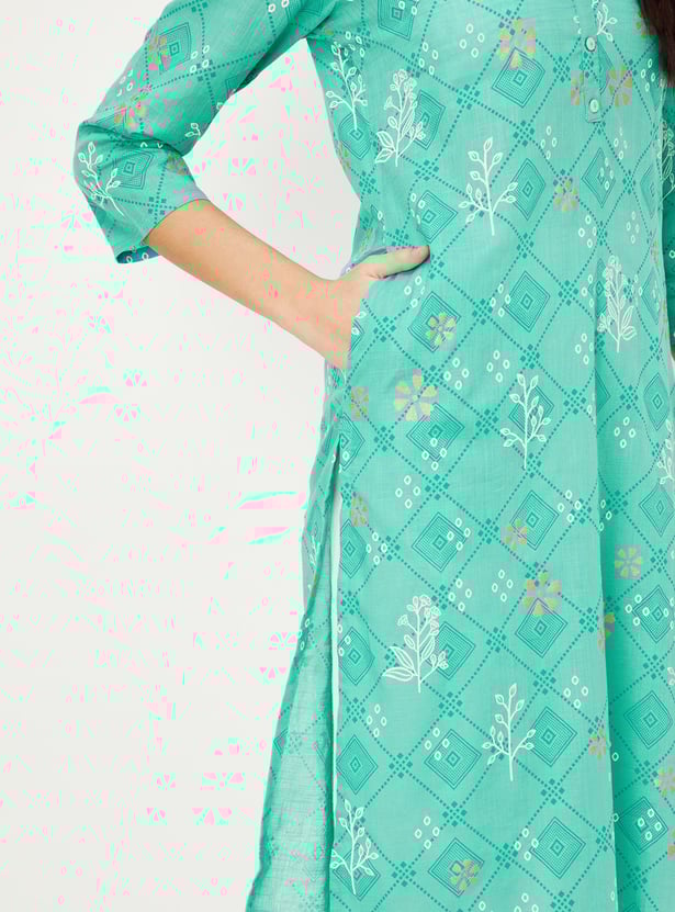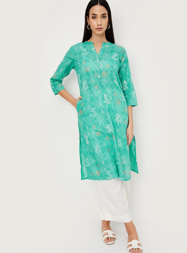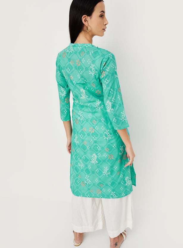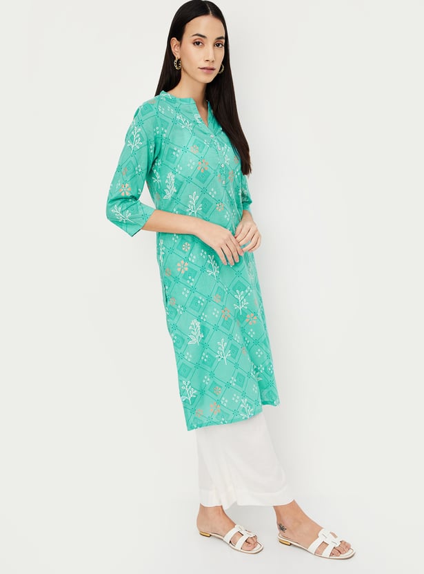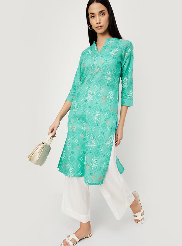 Refresh your wardrobe for the season with this straight kurta. Featuring a band collar, three-quarter sleeves, all-over prints, and a calf-length profile, this kurta offers a perfect blend of style and comfort.