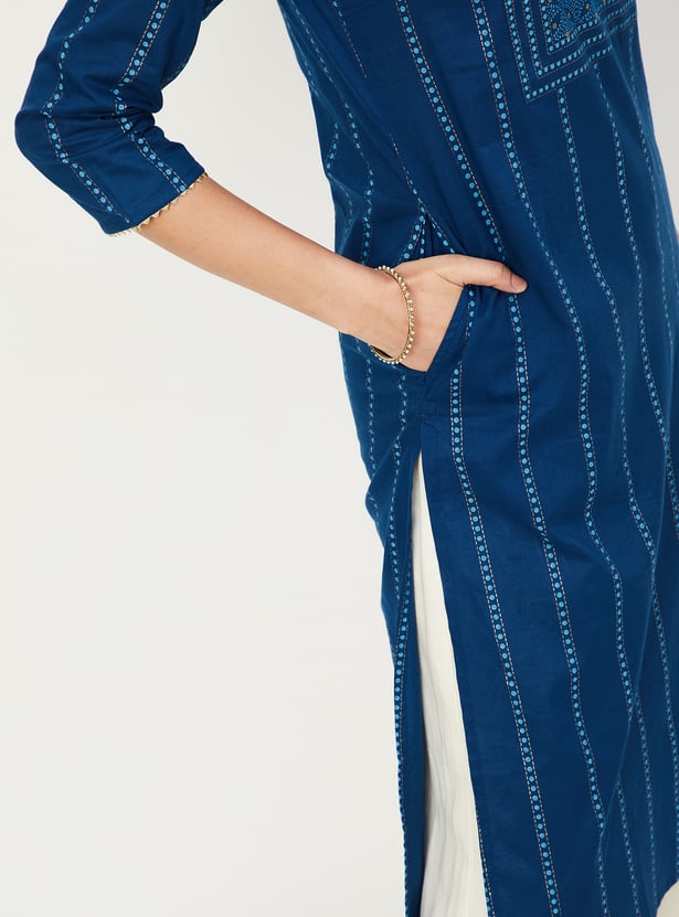 This kurta is a delightful addition to your casual wear collection, featuring a charming floral print, a classic round neck, three-quarter sleeves, and convenient pockets for a touch of practicality.