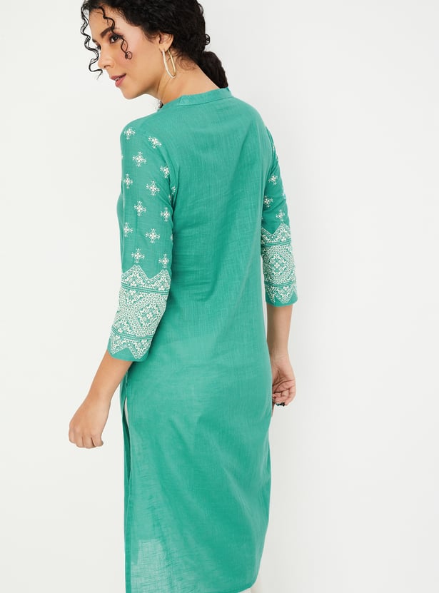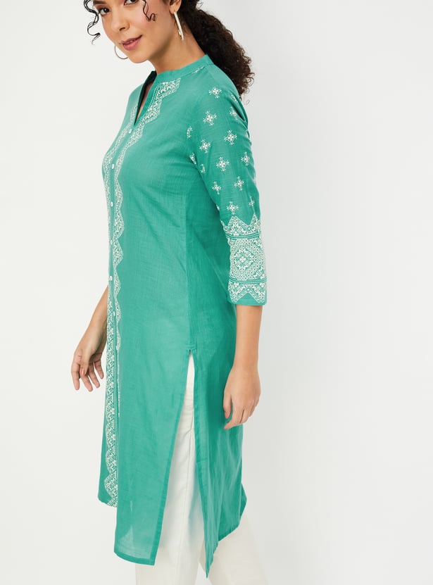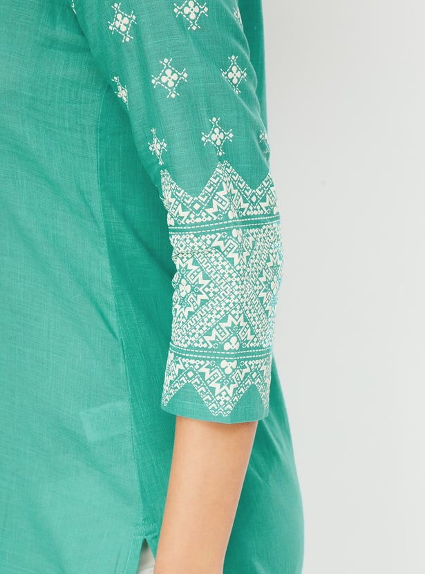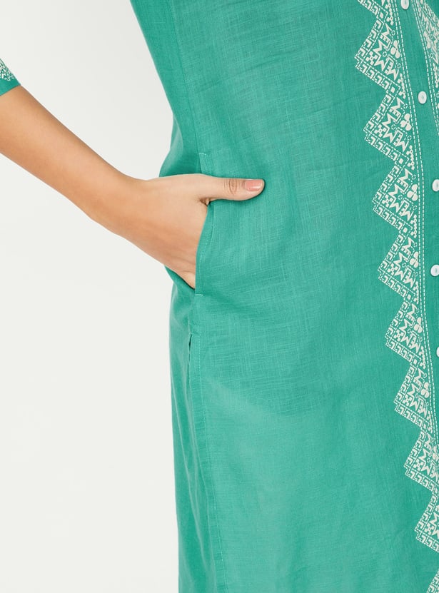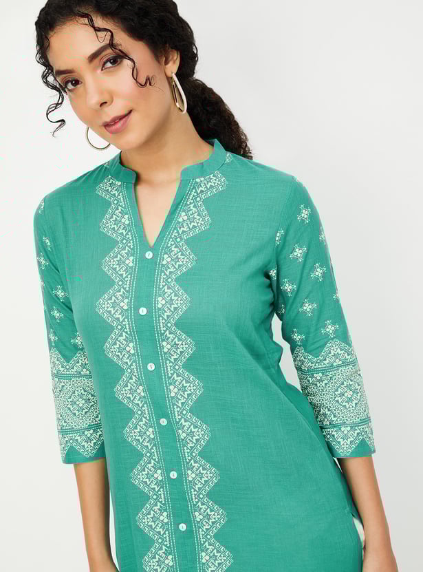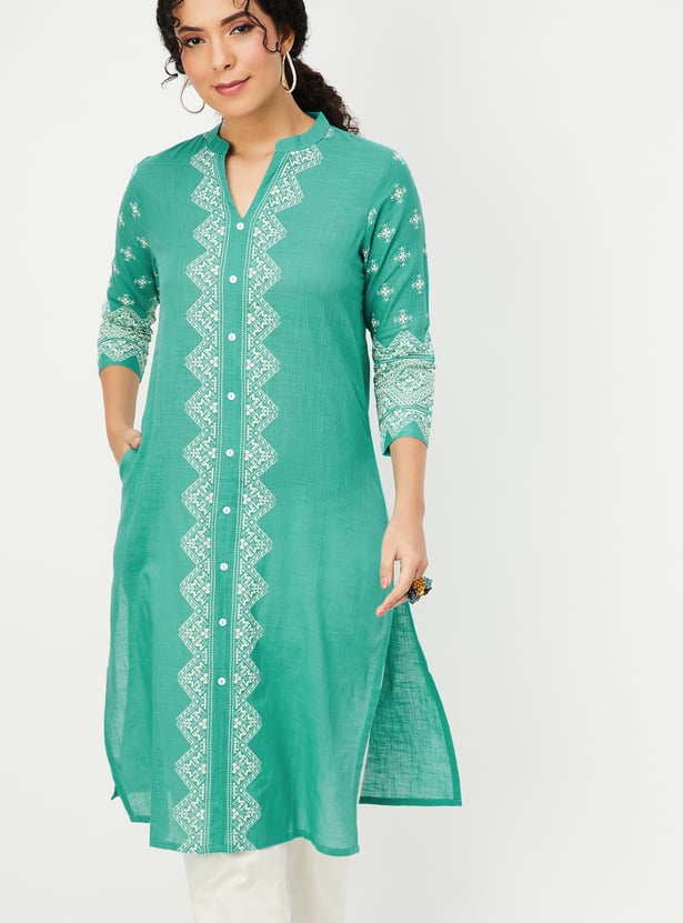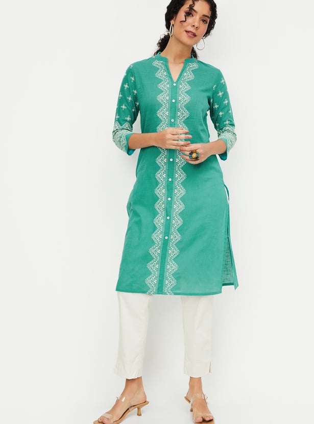 Refined and versatile, this printed straight kurta is perfect for everyday elegance. It features a band collar, button closure, 3/4th sleeves, side slits, and a side pocket for added convenience.