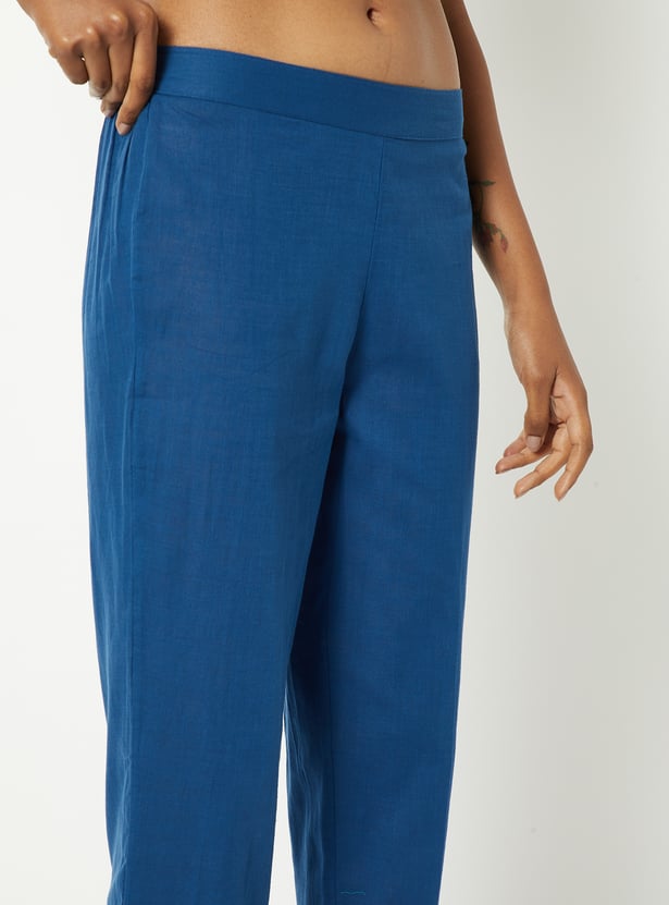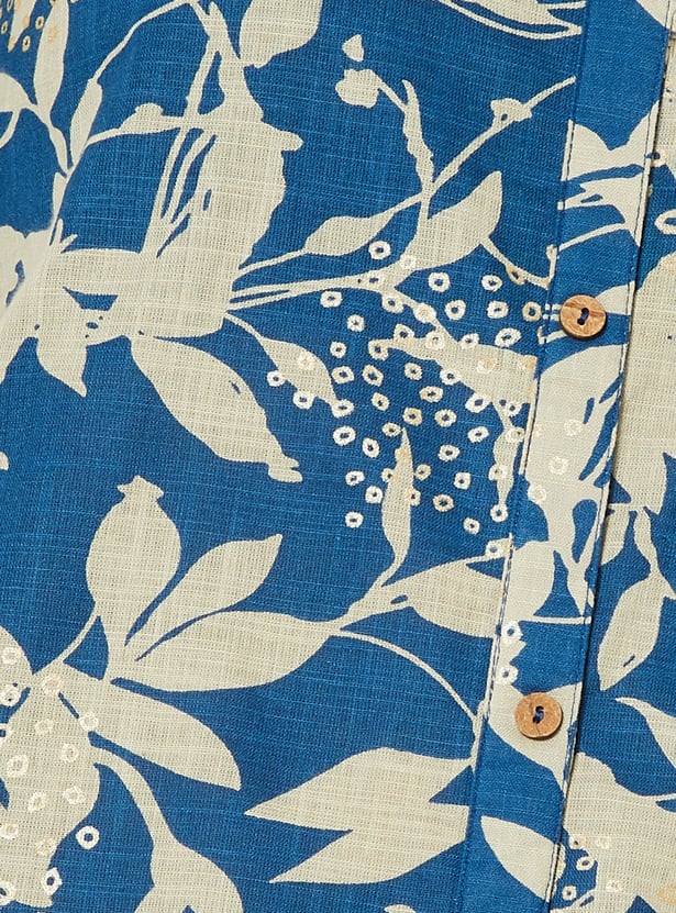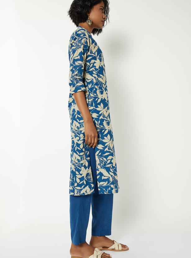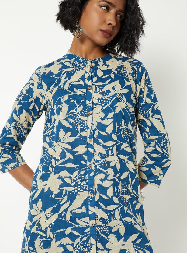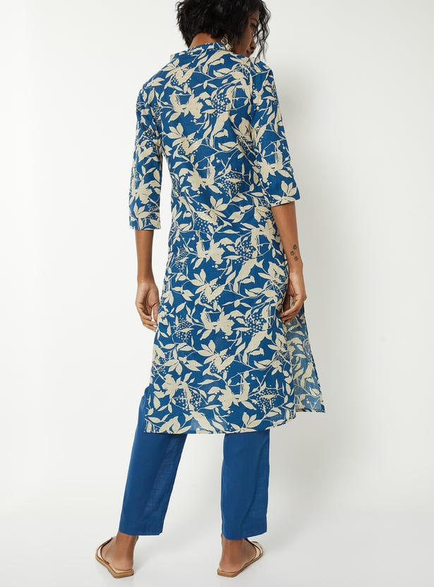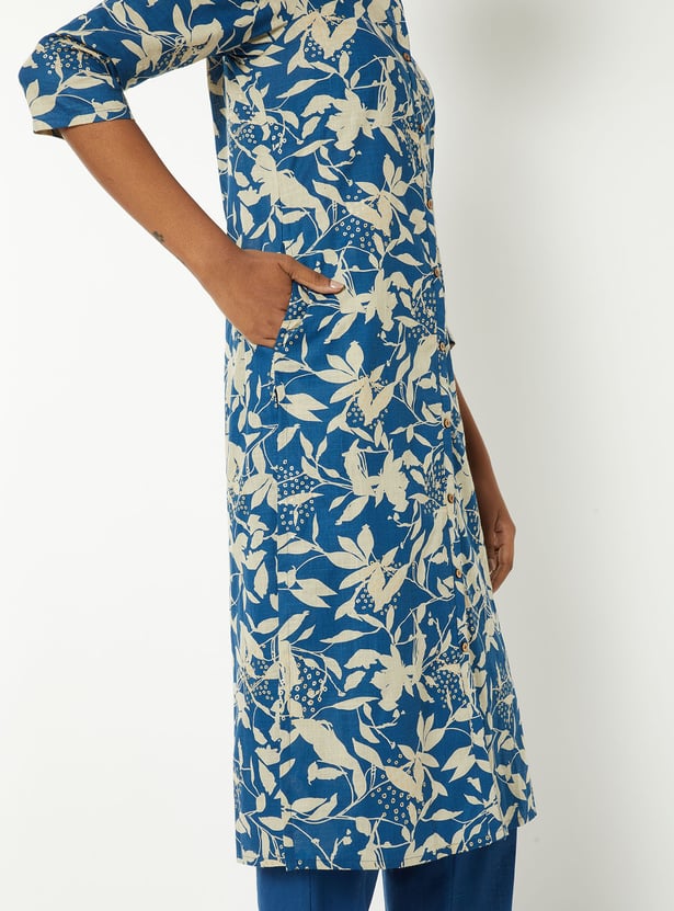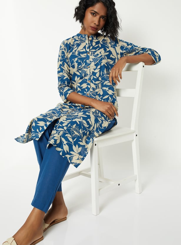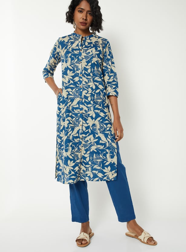 Elevate your everyday ethnic style with this printed kurta set featuring a chic mandarin collar, 3/4th sleeves, and a button-down front. The matching solid bottoms and convenient side pocket add comfort and functionality to this effortlessly elegant look.