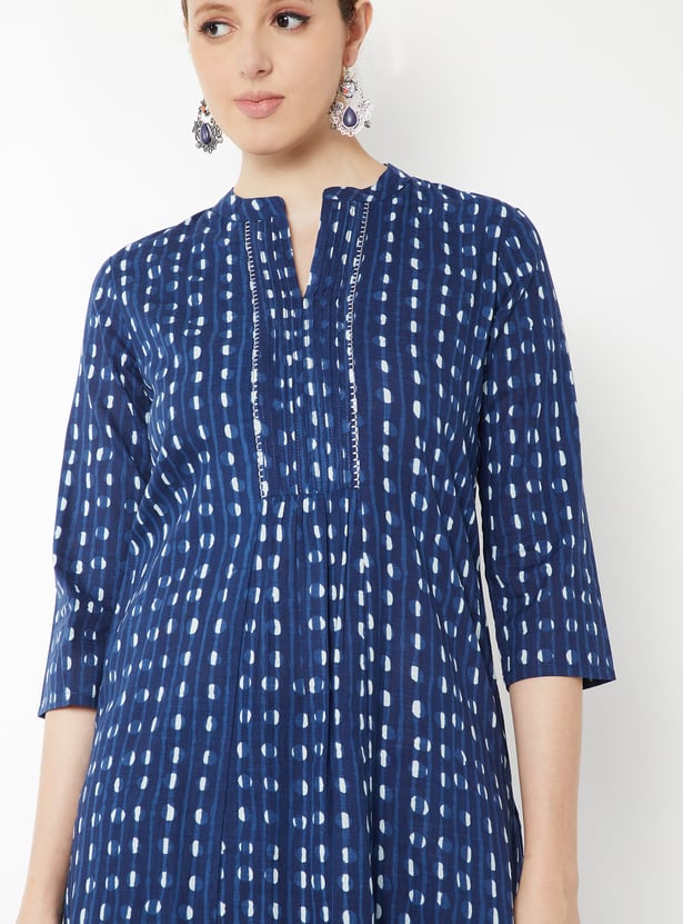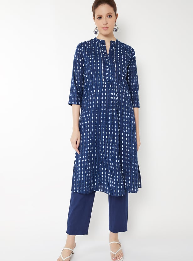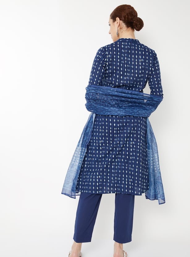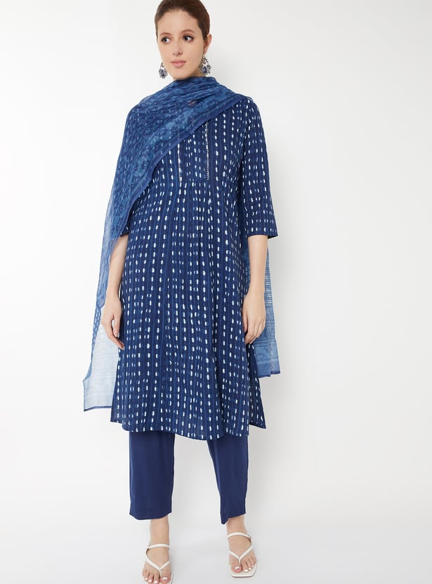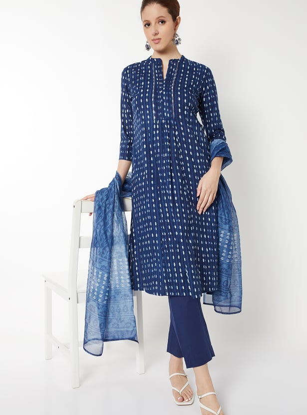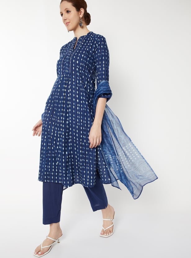 Add a refined touch to your ethnic collection with this printed straight kurta set, designed for elegance and ease. The kurta features a band collar, side slits, and 3/4th sleeves, offering a sleek silhouette with functional details. It is paired with straight pants that have an elasticated waist for comfort, and complemented with a dupatta that completes the ensemble.