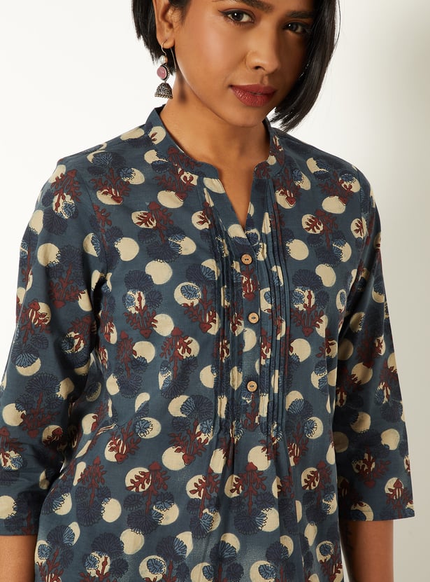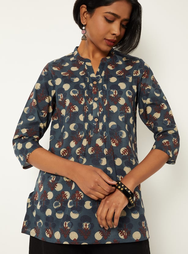 Flaunt your style with this straight kurti. It is designed with all-over prints, a band collar, and pintuck detailing. It features 3/4th sleeves and side slits.