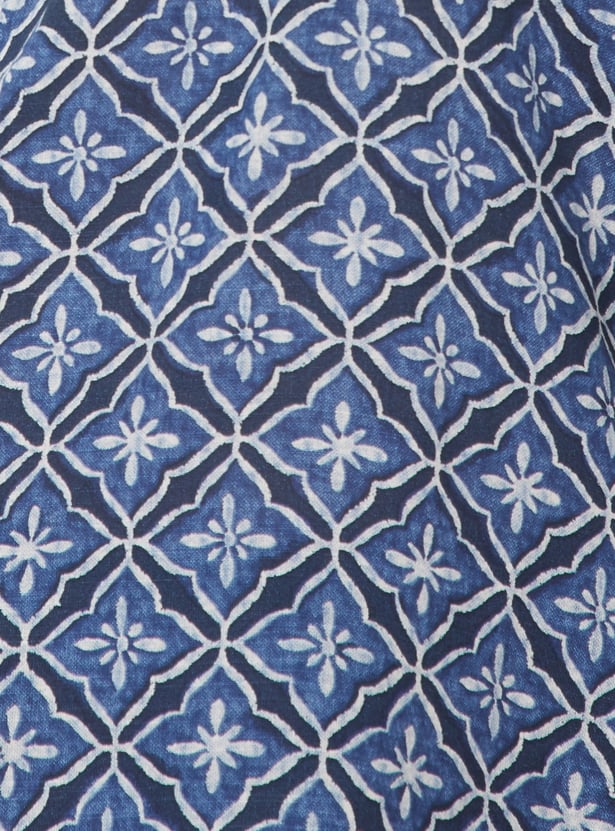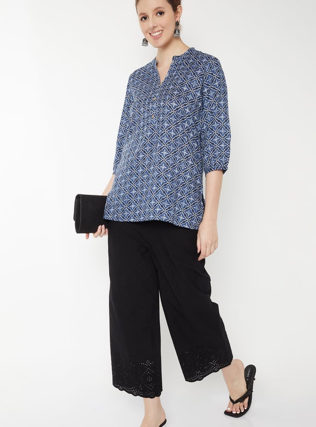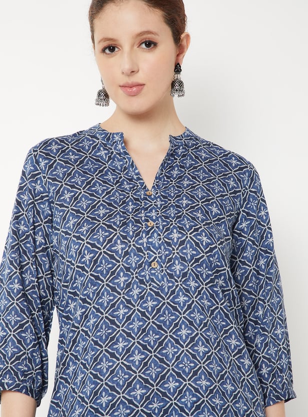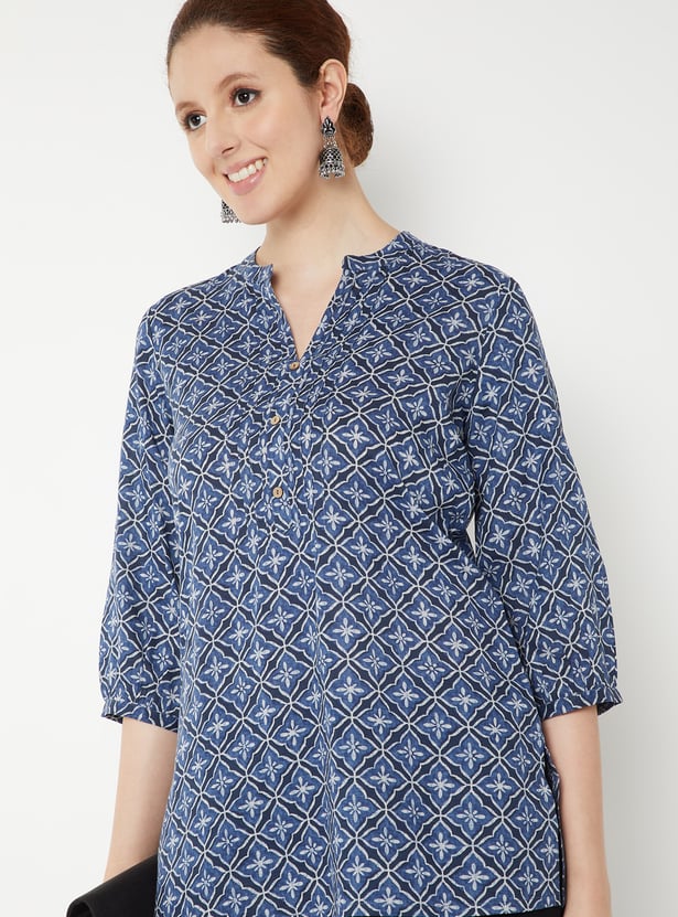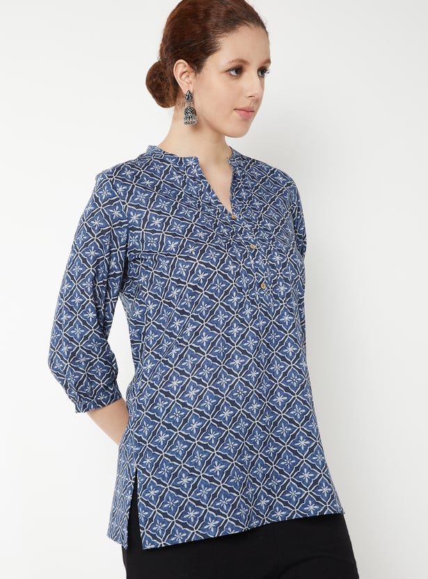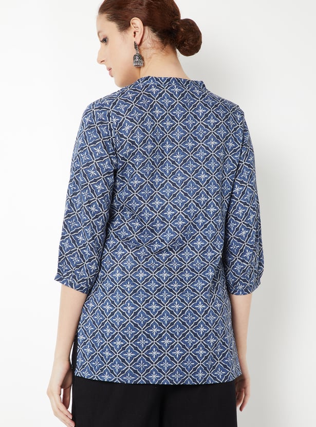 Refresh your ethnic wardrobe with this printed short kurti, designed for everyday charm and comfort. Featuring a band collar, 3/4th sleeves, and side slits, it offers a sleek silhouette with a modern touch, perfect for casual outings or workwear.
