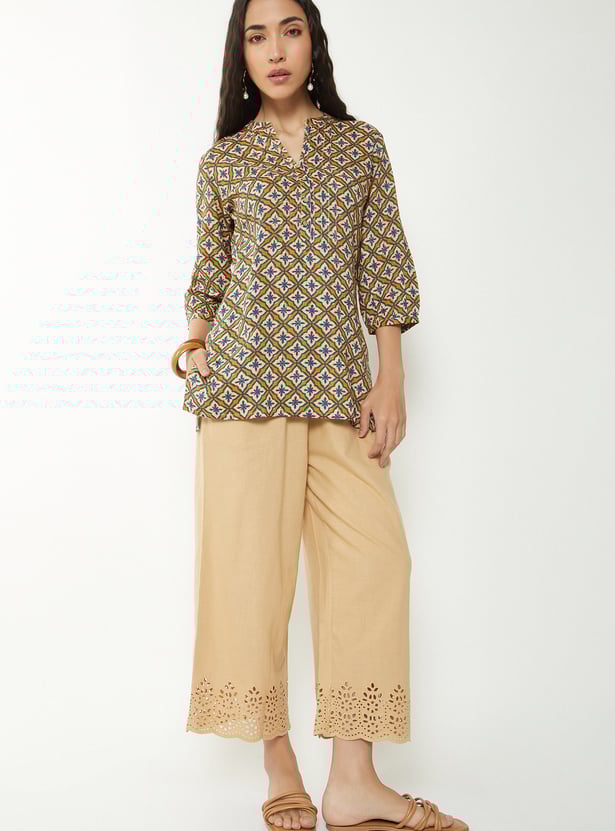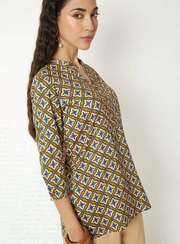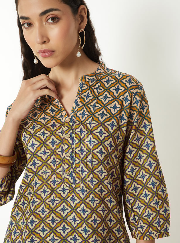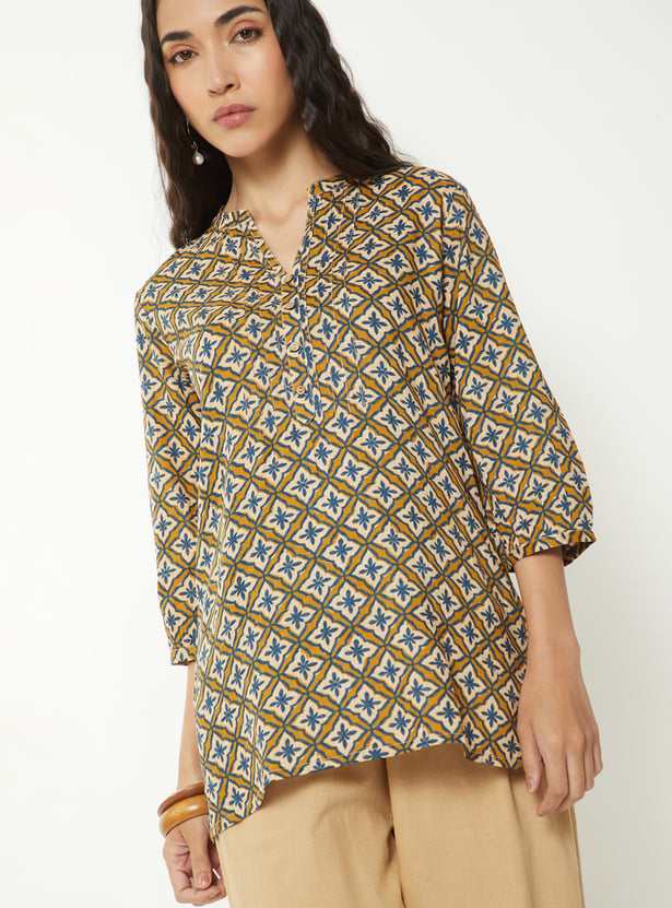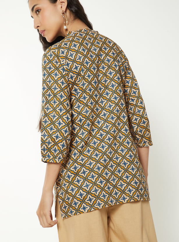 Refresh your ethnic wardrobe with this printed short kurti, designed for everyday charm and comfort. Featuring a band collar, 3/4th sleeves, and side slits, it offers a sleek silhouette with a modern touch, perfect for casual outings or workwear.