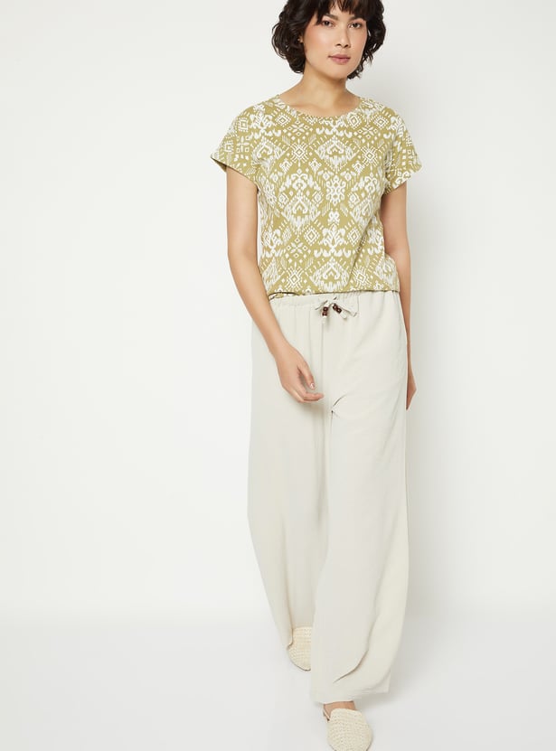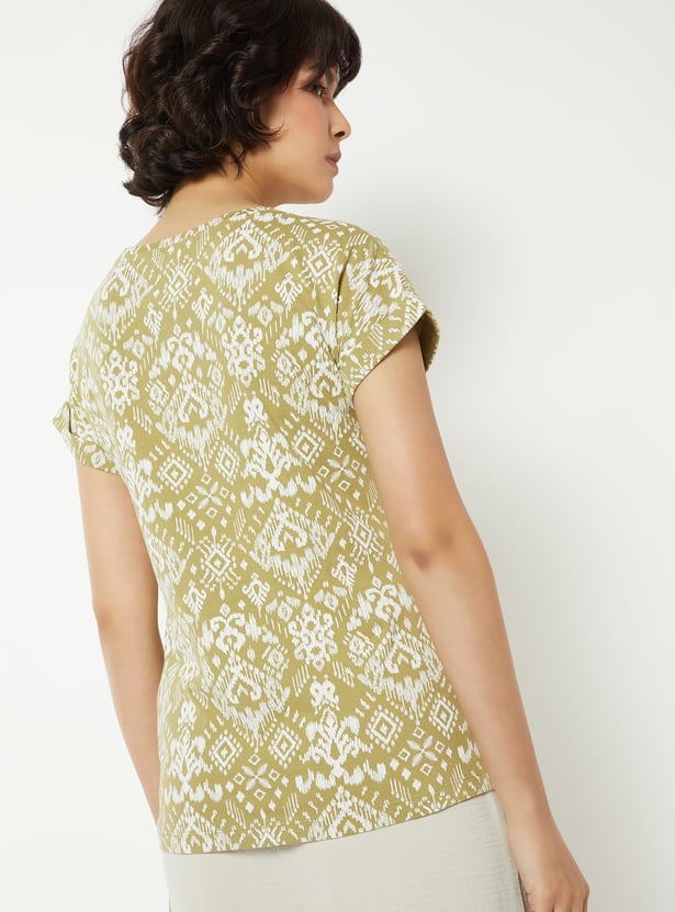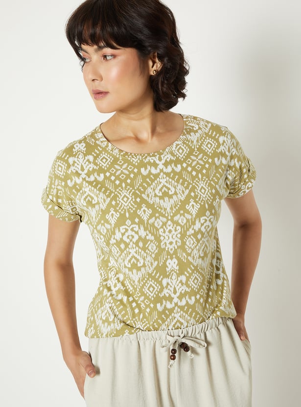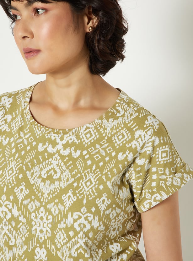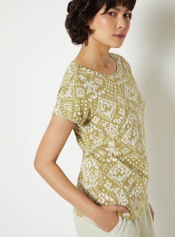 This T-shirt features a classic round neck and short sleeves, with a vibrant all-over print for a casual, stylish look. Designed in a regular fit, it’s perfect for everyday wear. Model Size :