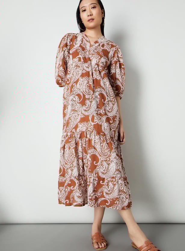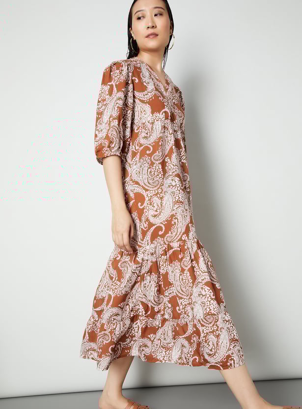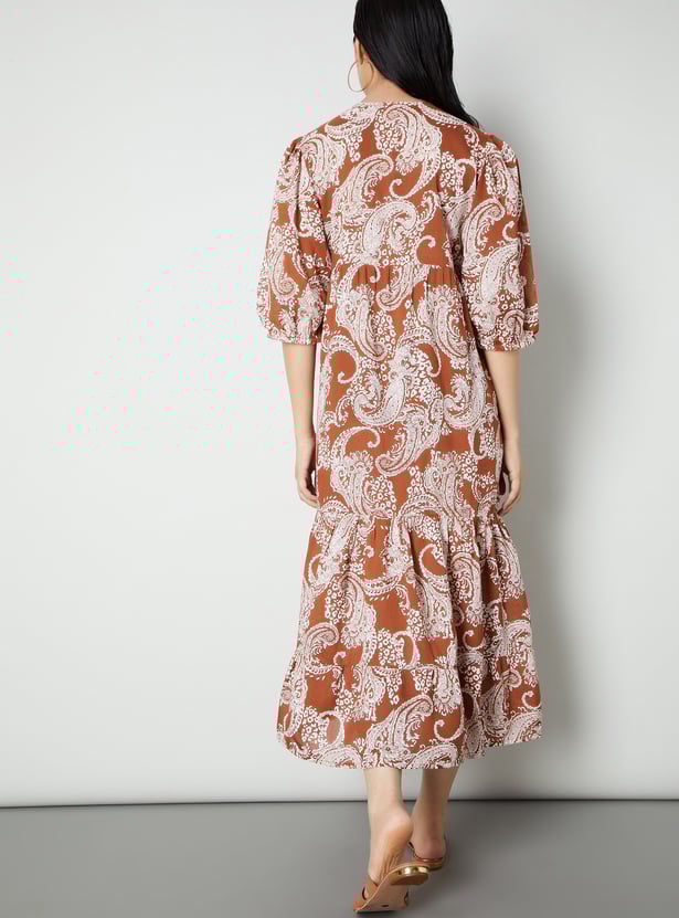 Flow through the day in effortless style with this printed tiered maxi dress. Featuring a flattering V-neck and elegant 3/4th sleeves for a breezy, feminine silhouette.