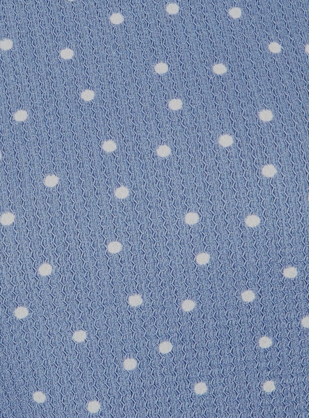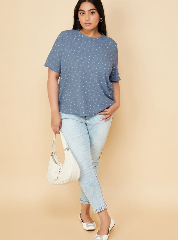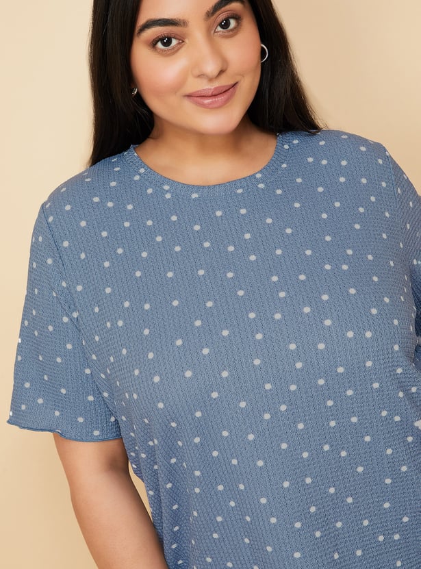 Let your style shine in this top. It is designed with a round neck, half sleeves, and a straight hem. The polka-dot prints add a classic touch. Model Size :
