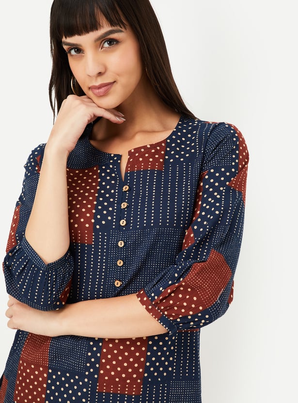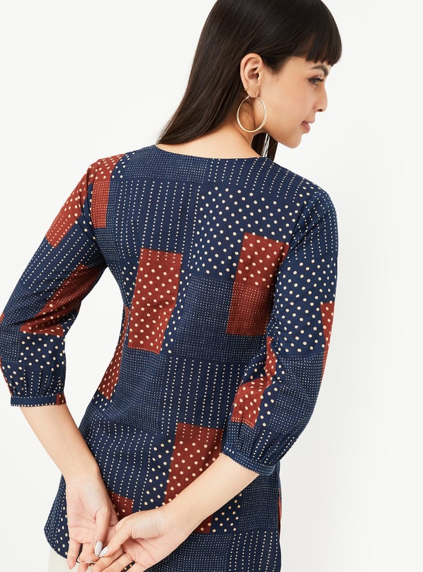 Add a pop of print to your look with this short printed tunic. It features a notch neck and 3/4th sleeves, offering a blend of comfort and casual style.