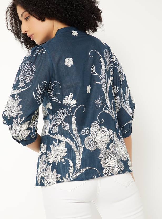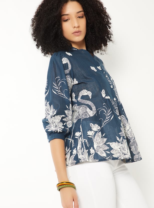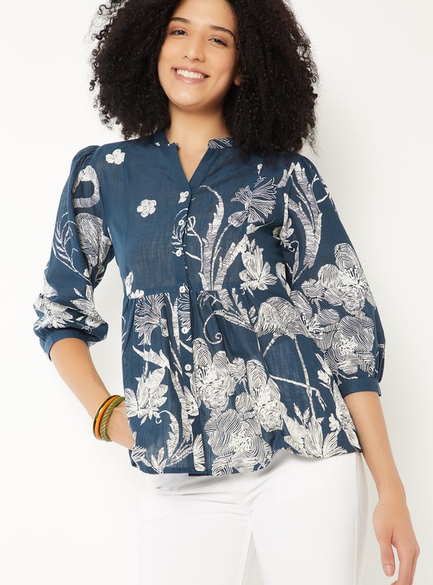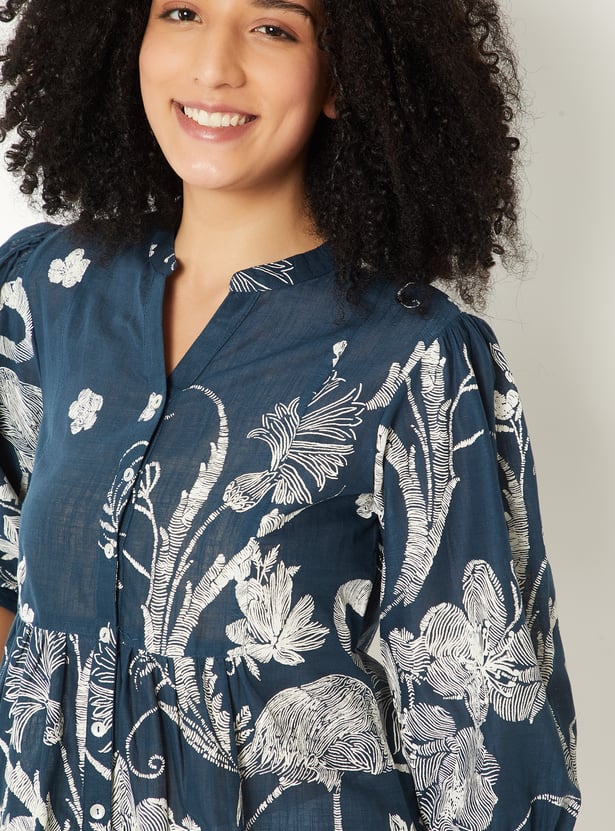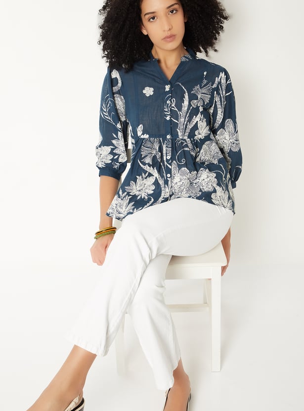 Effortlessly chic, this printed tunic features a smart band collar and 3/4th sleeves for a polished yet comfortable look. Perfect for casual outings or semi-formal settings, it blends style with ease.
