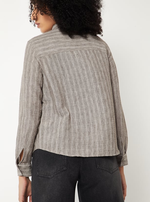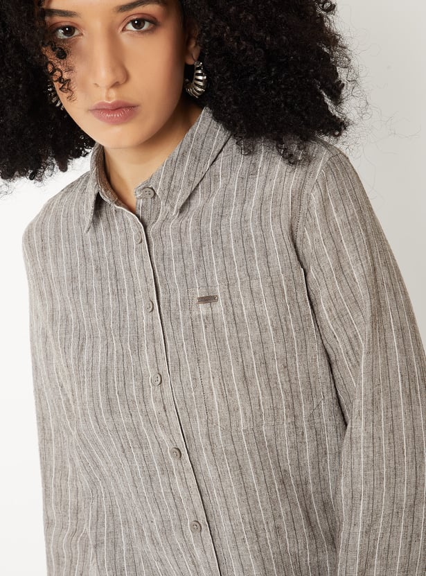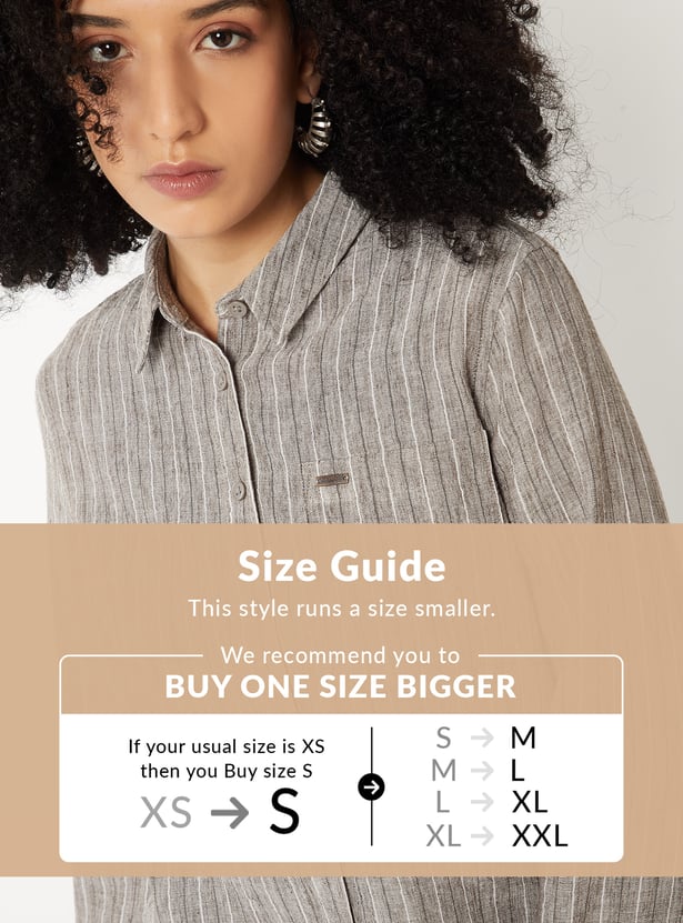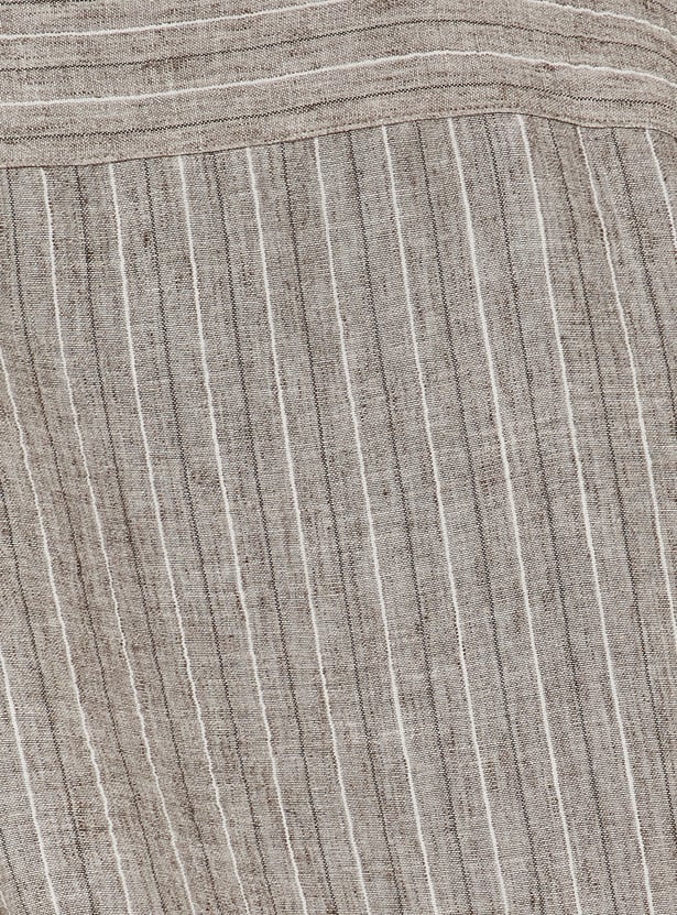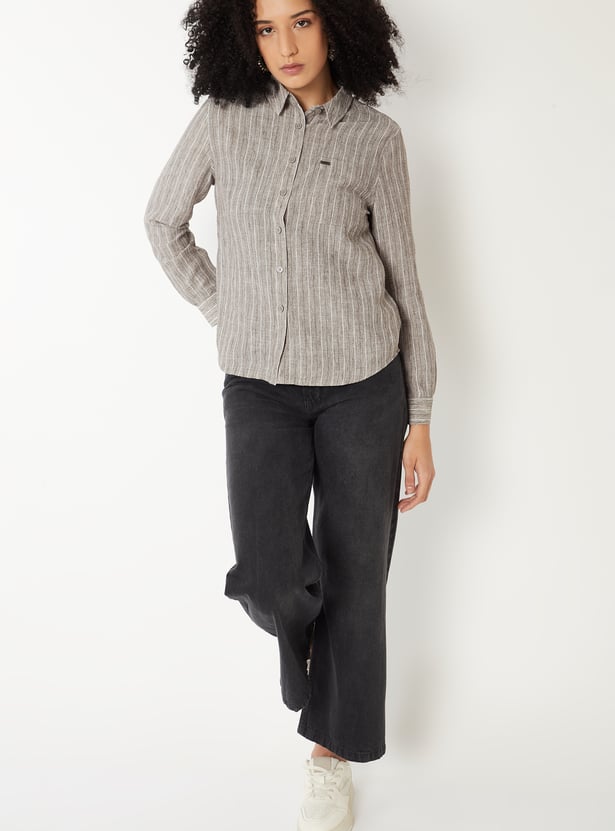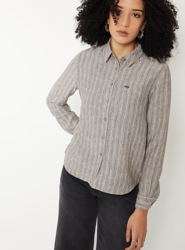 A regular fit striped shirt designed with a spread collar, button-down front, and full sleeves for a structured yet comfortable feel. Finished with a single pocket, it’s a reliable choice for workdays, casual plans, and everyday styling.