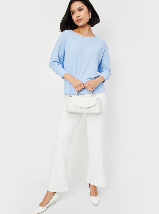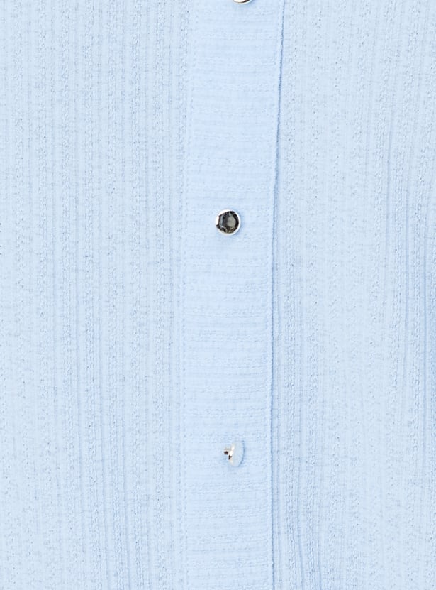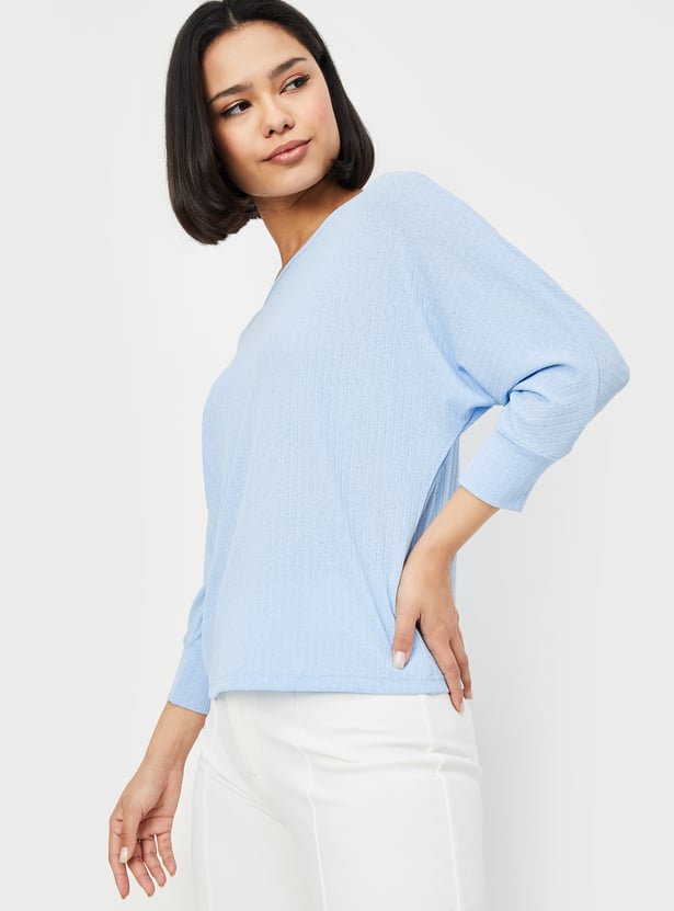 This rib-knit top with extended sleeves offers a perfect blend of comfort and style. The round neck and back button closure add subtle details, making it a versatile piece for any occasion. Model Size :