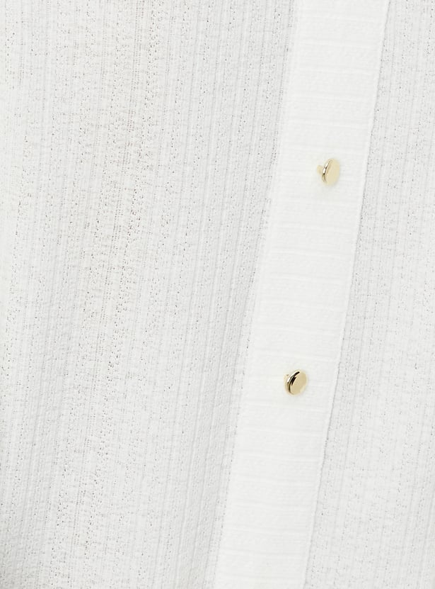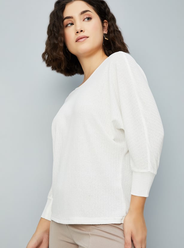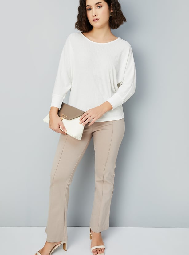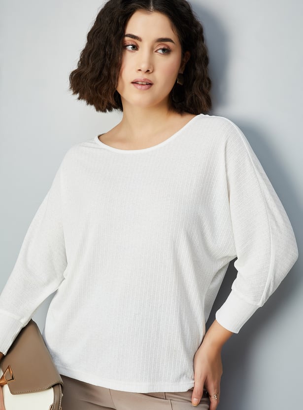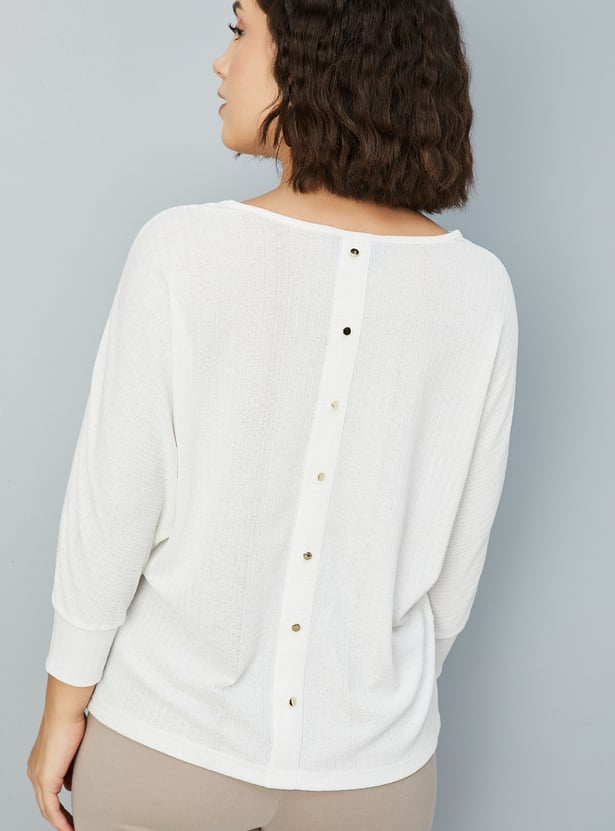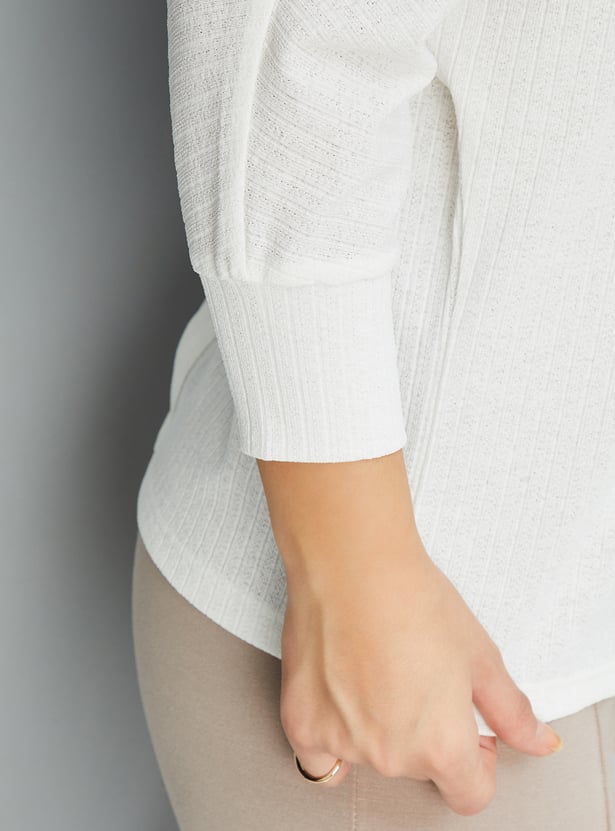 This rib-knit top with extended sleeves offers a perfect blend of comfort and style. The round neck and back button closure add subtle details, making it a versatile piece for any occasion. Model Size :
