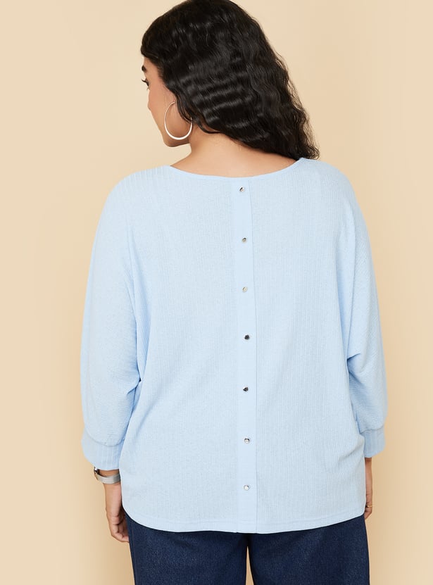 This rib-knit top with extended sleeves offers a perfect blend of comfort and style. The round neck and back button closure add subtle details, making it a versatile piece for any occasion. Model Size :