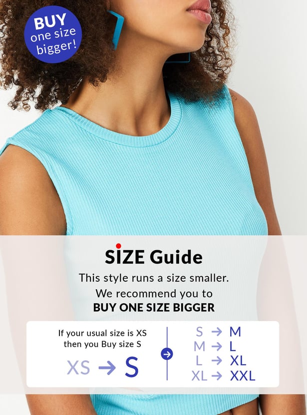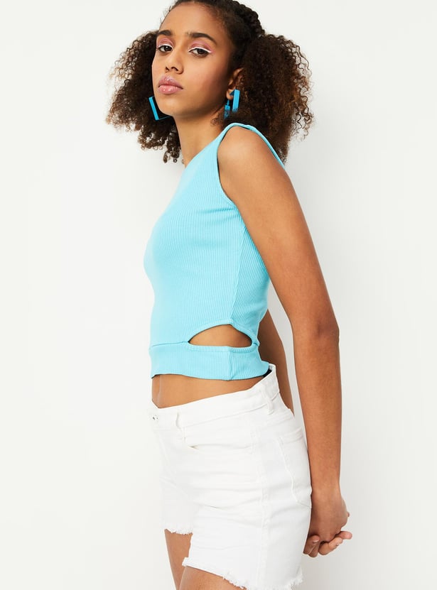 Give a makeover to your wardrobe with this trendy and stylish crop top. It is designed with a ribbed surface, a round neckline, side cutout detail, and sleeveless construction. Team it with a pair of jeans and lace-up shoes to make your outfit look elegant.