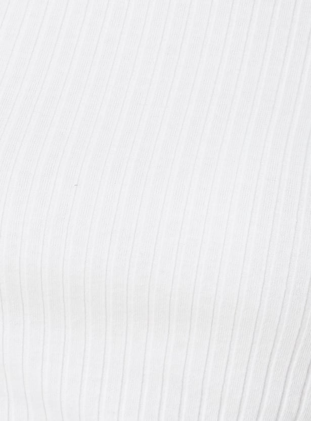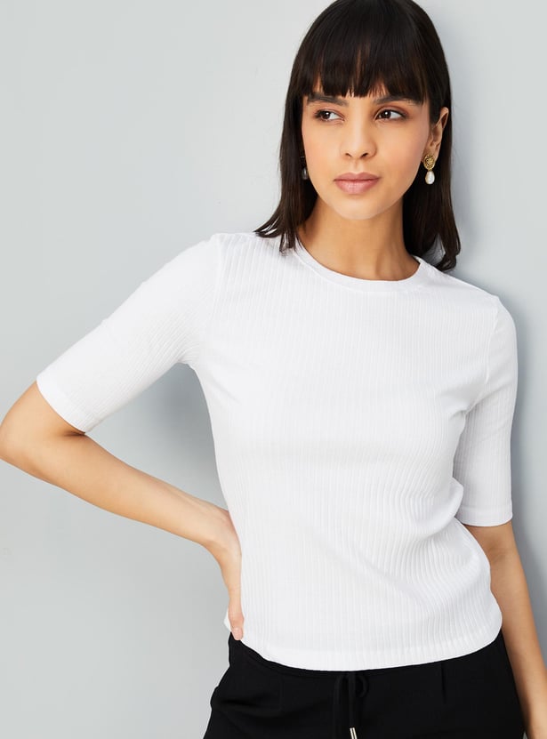Expand your wardrobe with versatile pieces such as this ribbed top, designed with a classic round neck and flattering half sleeves.