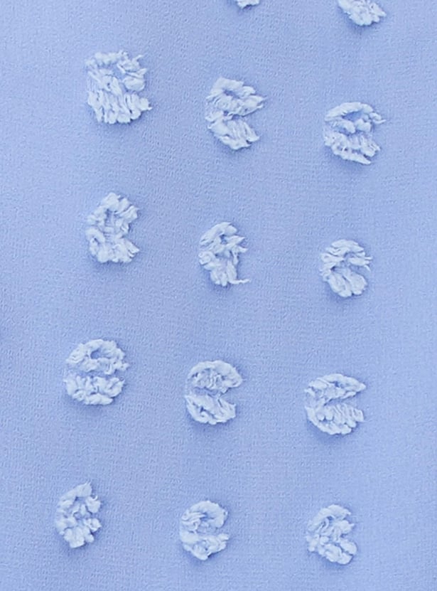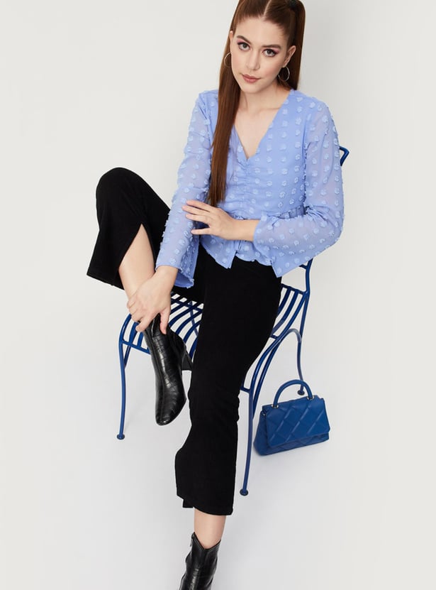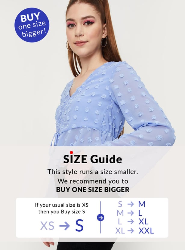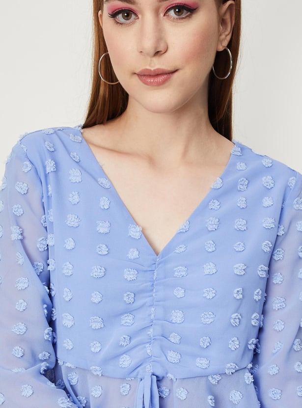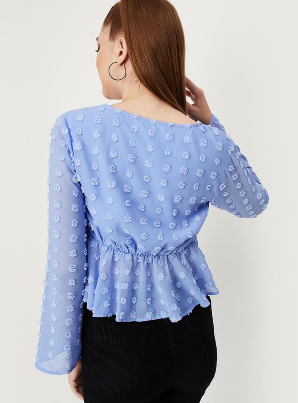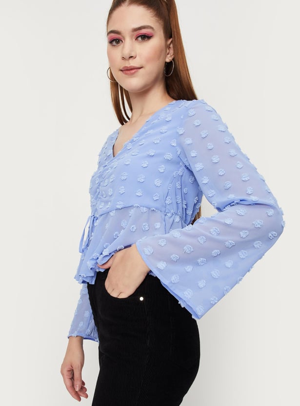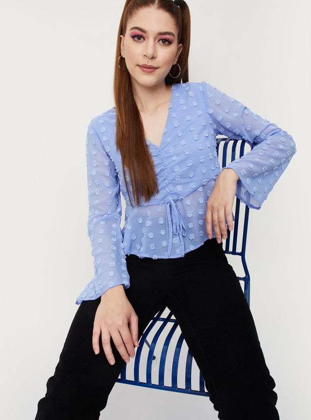 Refresh your casual styling with this top highlighted with a textured pattern all over. It features a V-neck, bell sleeves, a ruched front with a tie-up, and a peplum hem. Pair this top with jeans and boots.