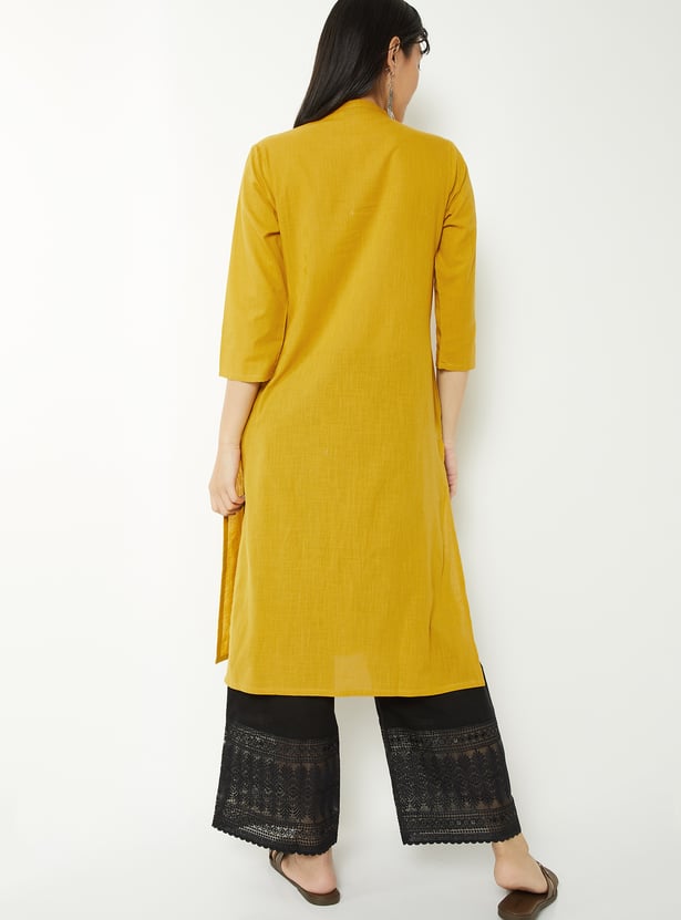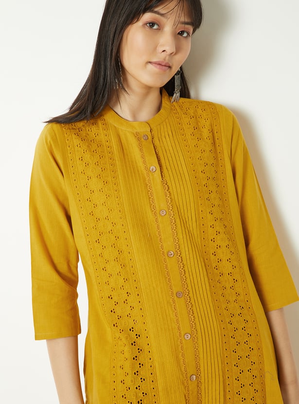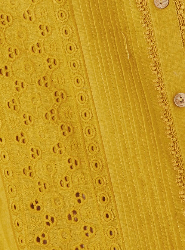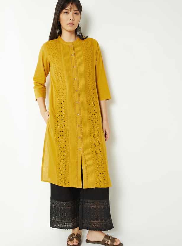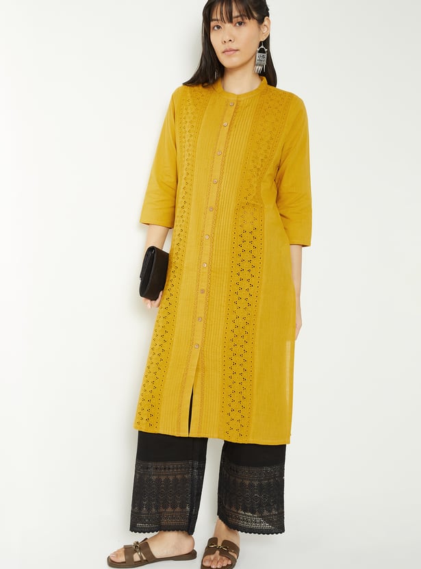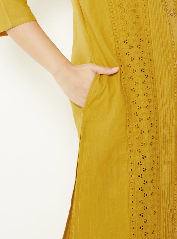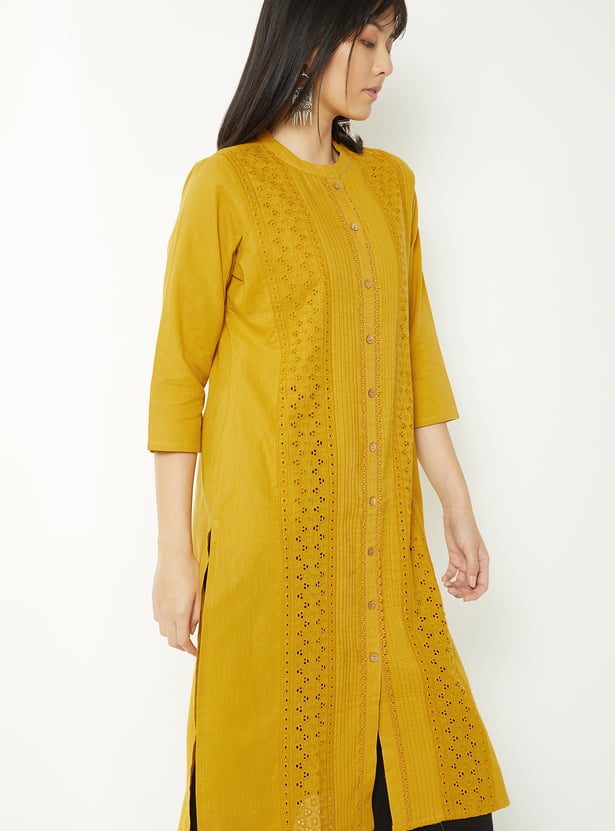 Bring effortless elegance to your ethnic wear with this Schiffli straight kurta, styled with a neat band collar and 3/4th sleeves. The button placket adds a touch of sophistication, while side slits ensure ease of movement and a graceful silhouette.