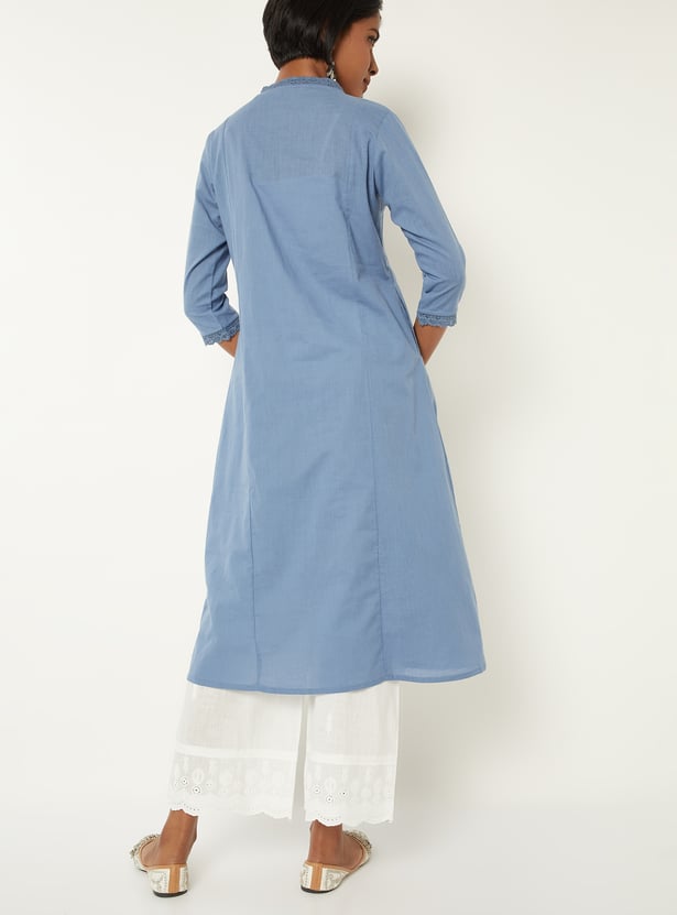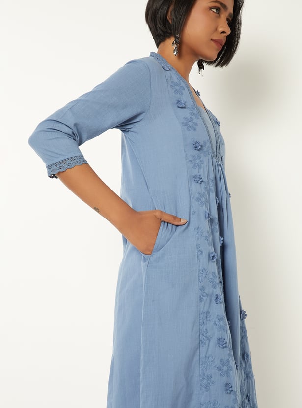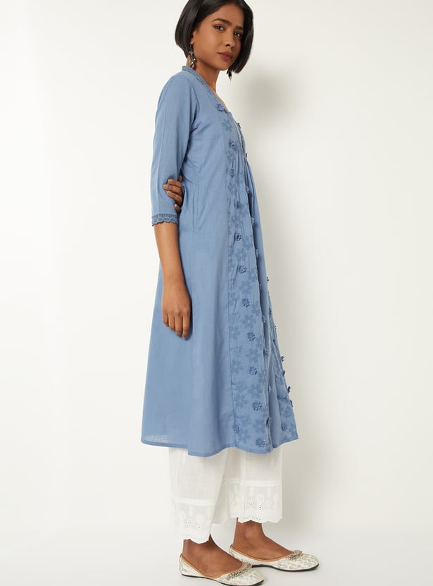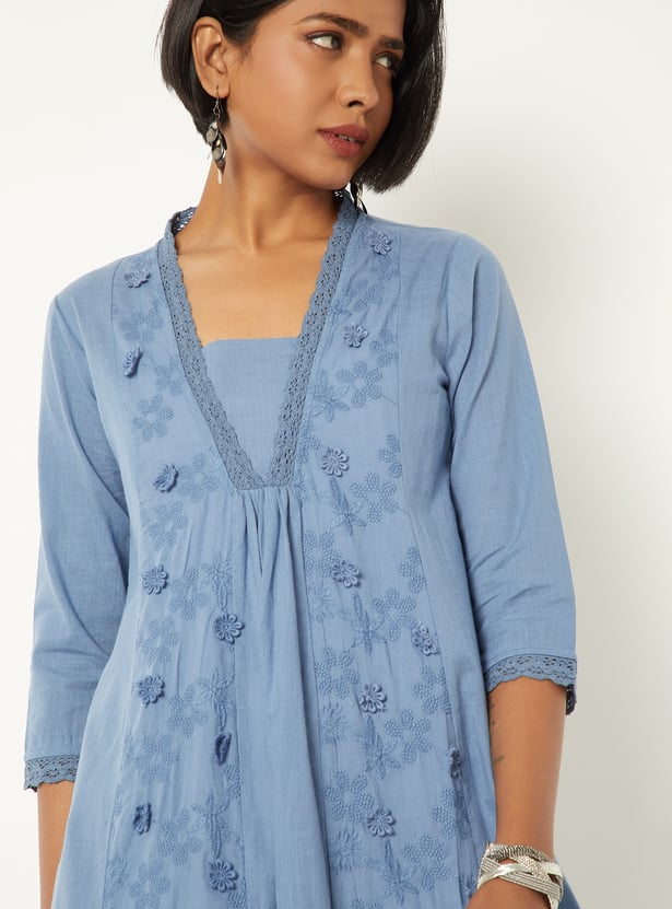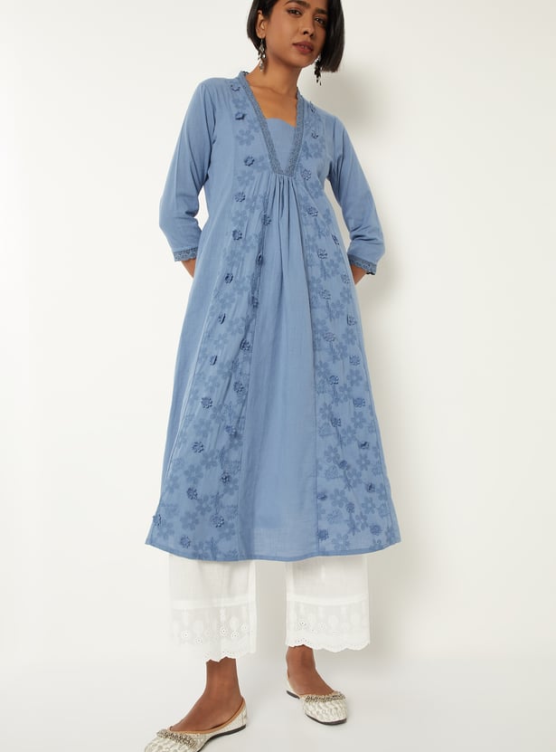 Add a touch of elegance to your ethnic edit with this Schiffli Kalidar kurta, featuring a stylised neck and three‑quarter sleeves. Thoughtfully designed with handy pockets and delicate appliqué details, it blends comfort with artisanal charm—perfect for festive gatherings or casual chic.