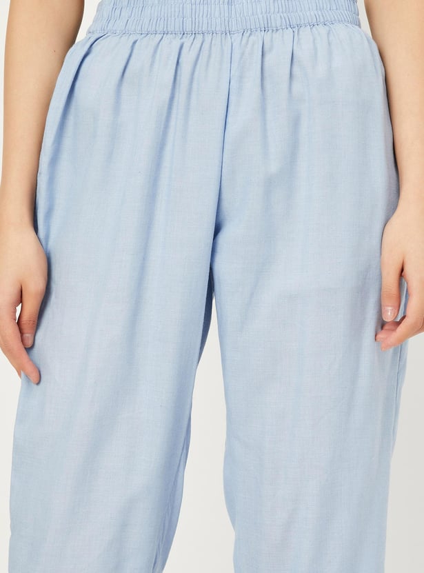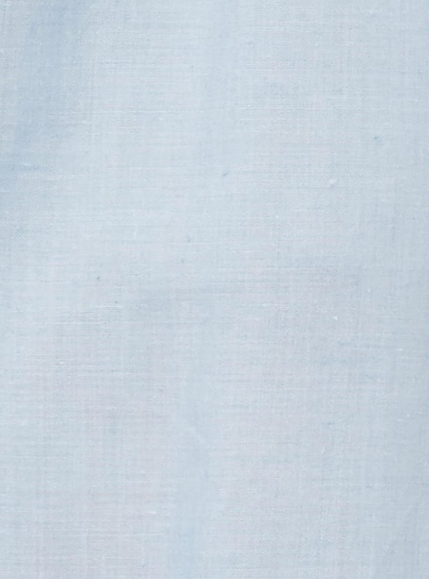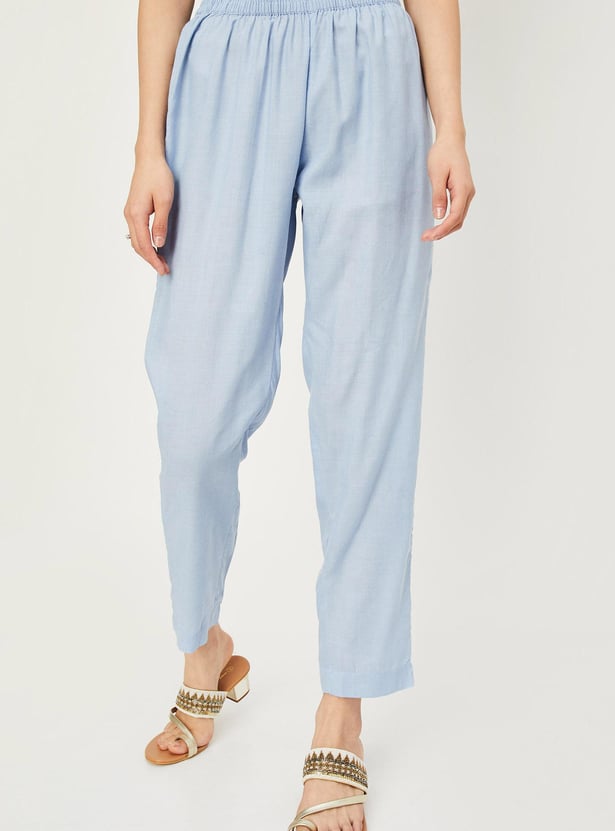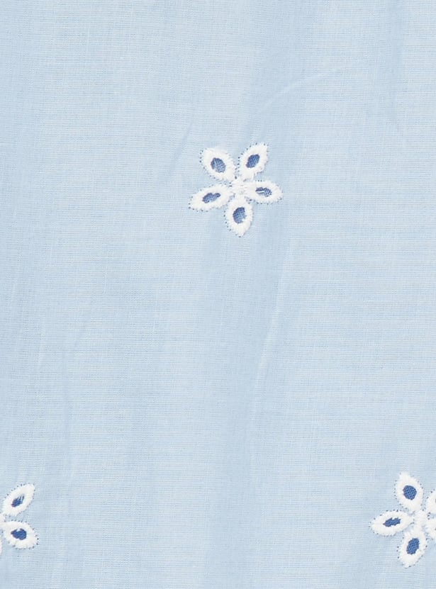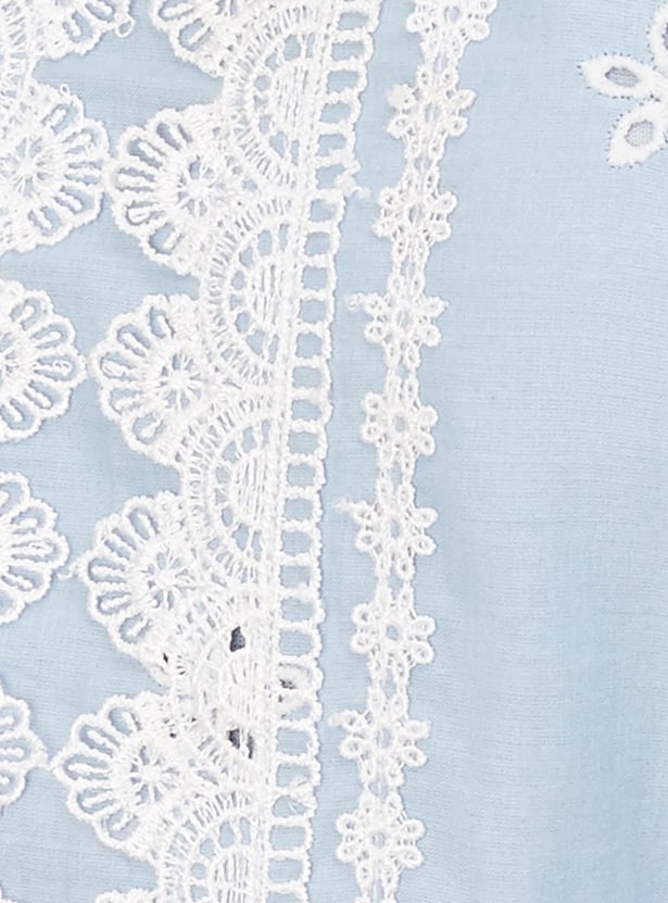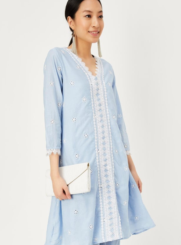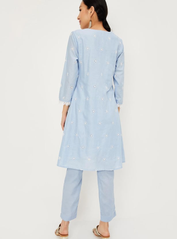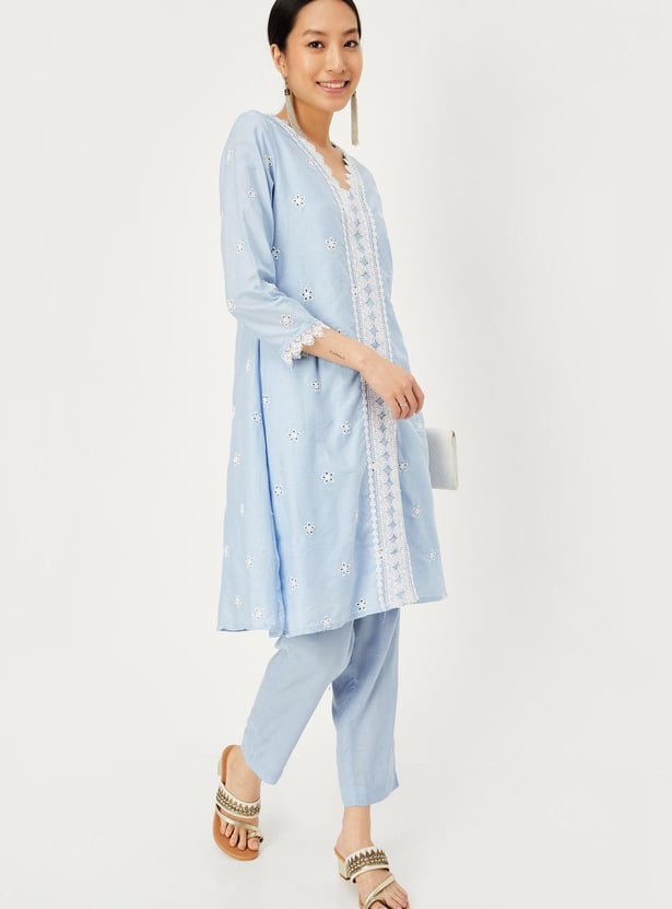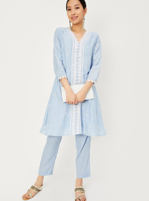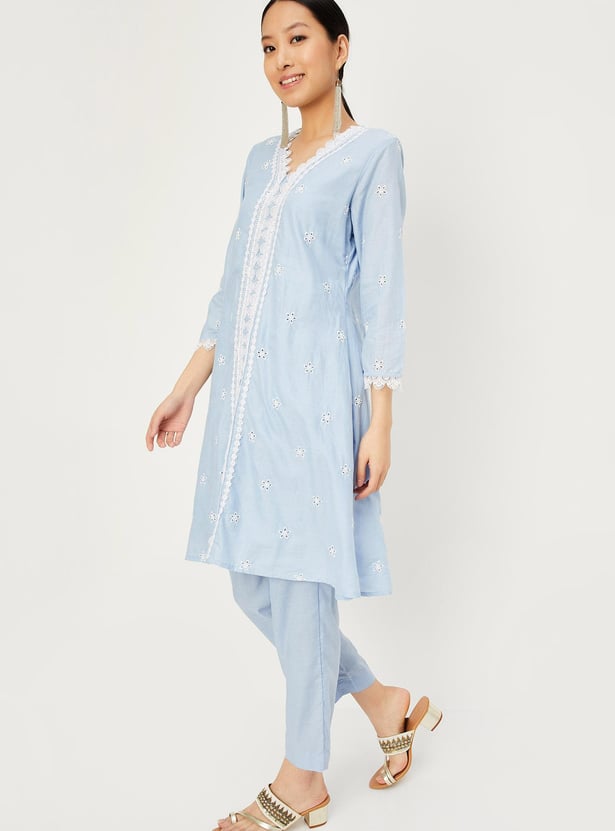Paint a picture of elegance in this ethnic set. It includes an A-line kurta highlighted with lace panels and accents and schiffli embroidery. This kurta has a V-neck, three-quarter sleeves, and a knee-length profile. The pair of straight pants is rendered in a solid tone with an elasticated waist.