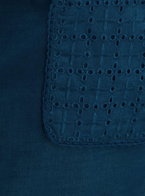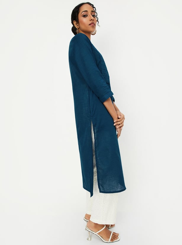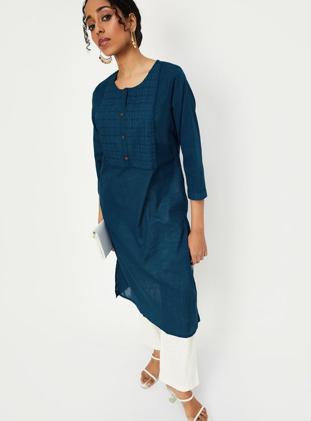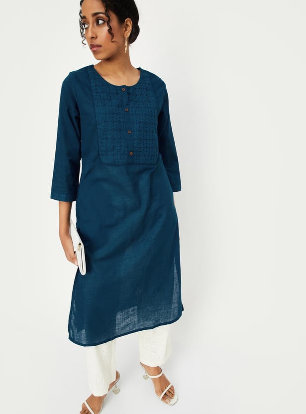 Flaunt a look of elegance in this kurta, It has a beautiful schiffli embroidery at the yoke, a round neck, a button placket, three-quarter sleeves, and a knee-length construction.