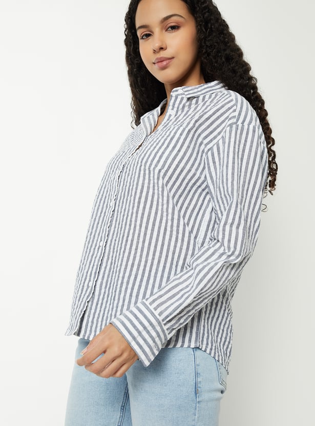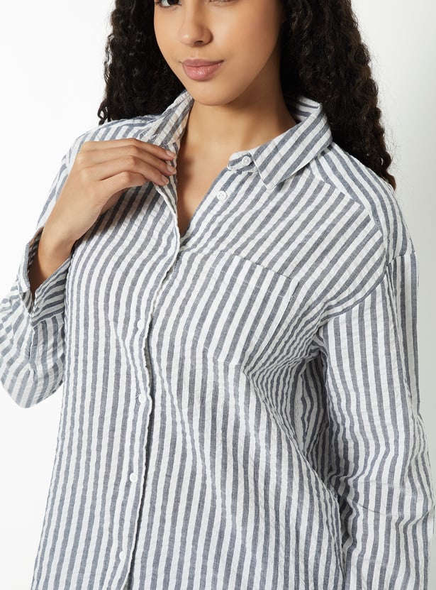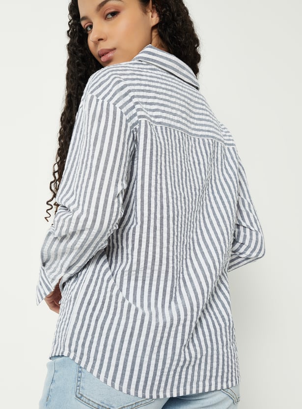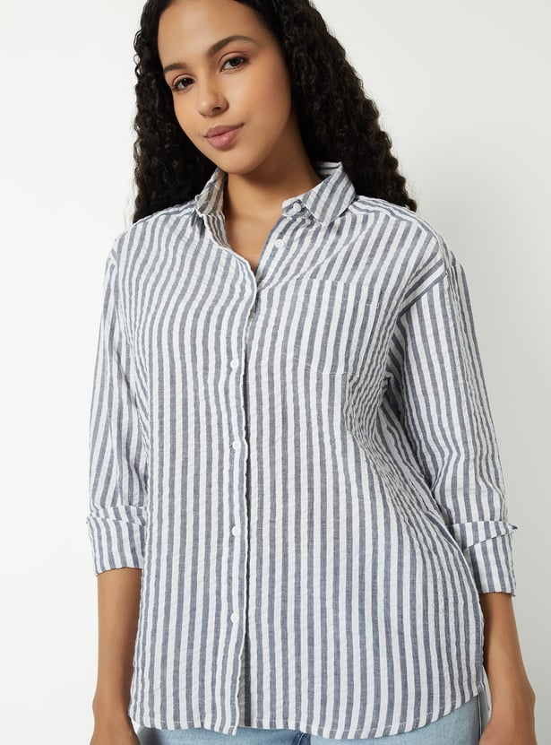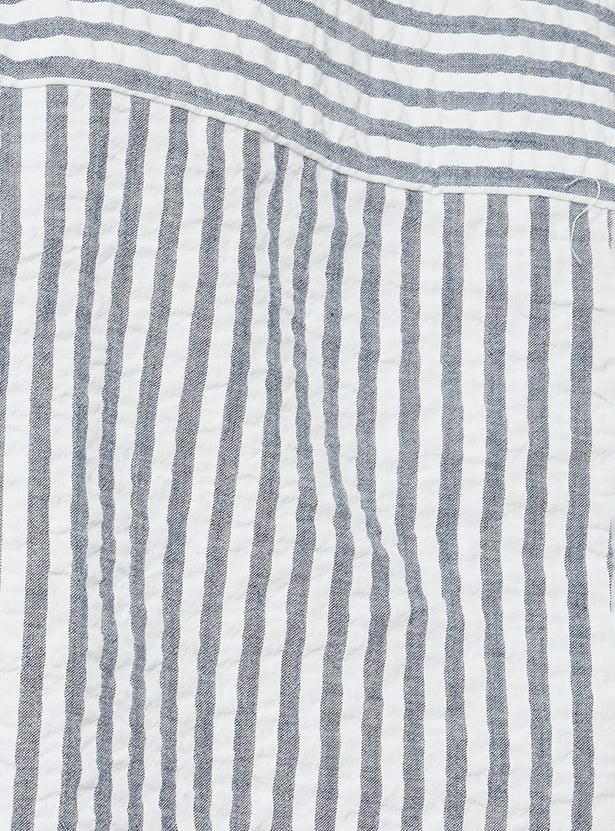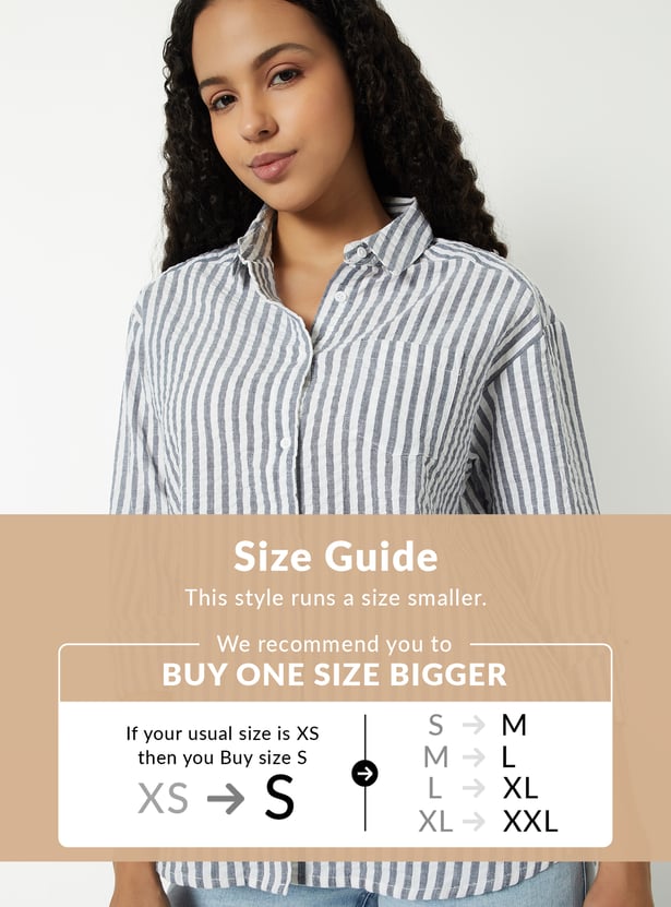 This regular fit shirt features the classic striped seersucker pattern, a spread collar, a button placket, patch pocket, and full sleeves finished with button cuffs for a clean, polished look. Model Size :