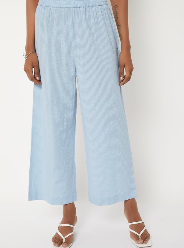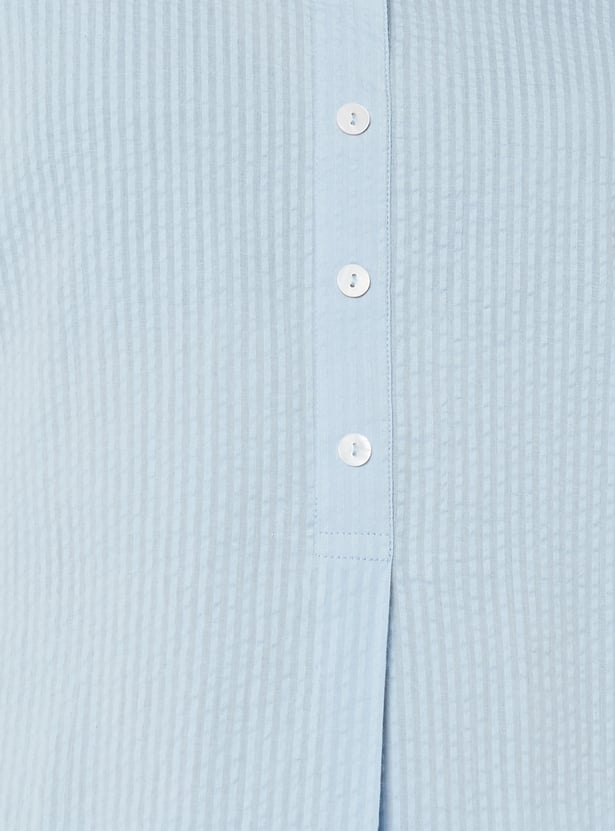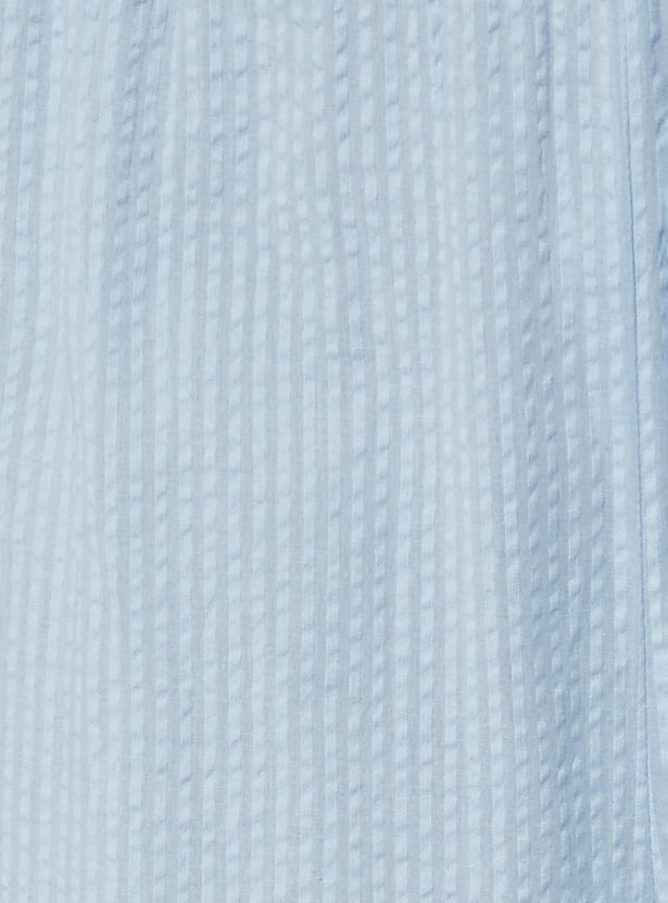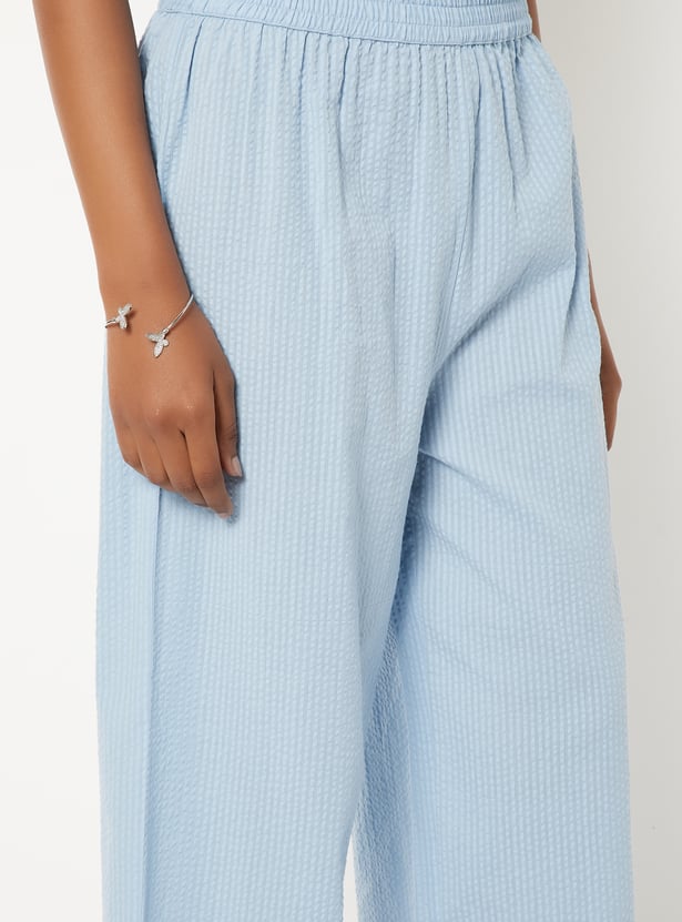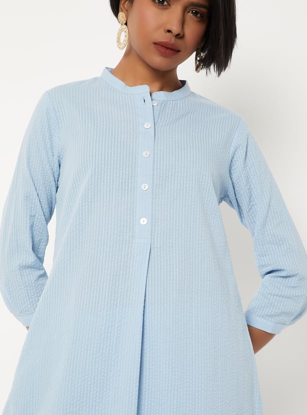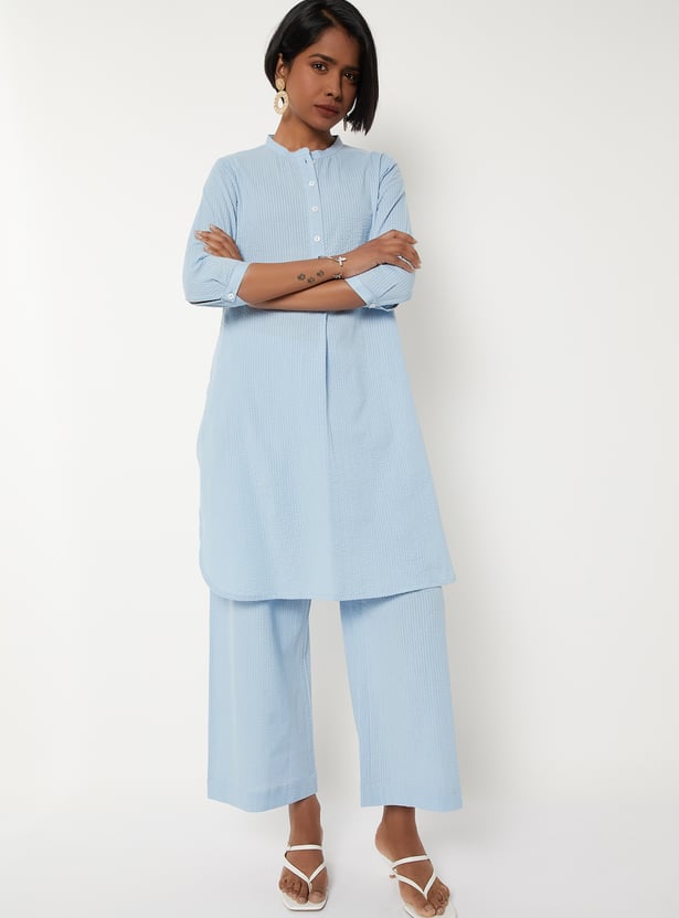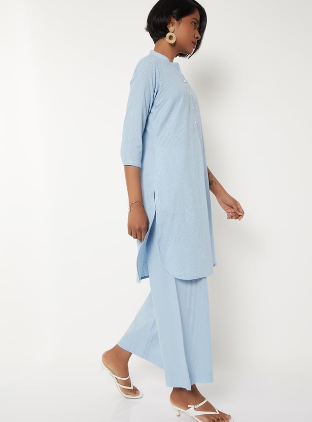 Elegant yet comfortable, this seersucker straight kurta set is designed with a button placket, band collar, 3/4th sleeves, and side slits for ease of movement. It is paired with palazzos featuring an elasticated waist, offering both style and comfort in a coordinated ensemble.