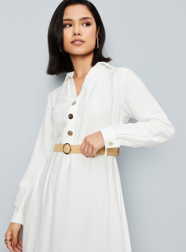 Elevate your wardrobe with this A-line midi belted dress! Featuring a collared neckline, full cuffed sleeves, and a half-button placket, it combines classic style with a modern twist for the perfect fit.