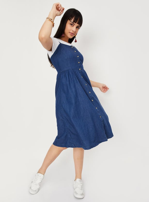 Women Solid A-line Denim Dress with T-shirt