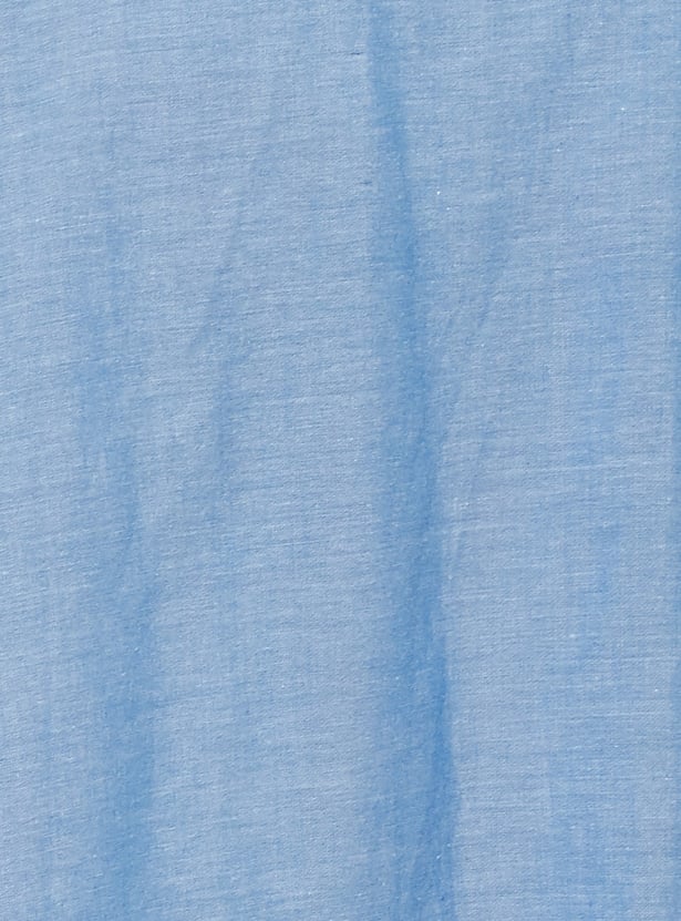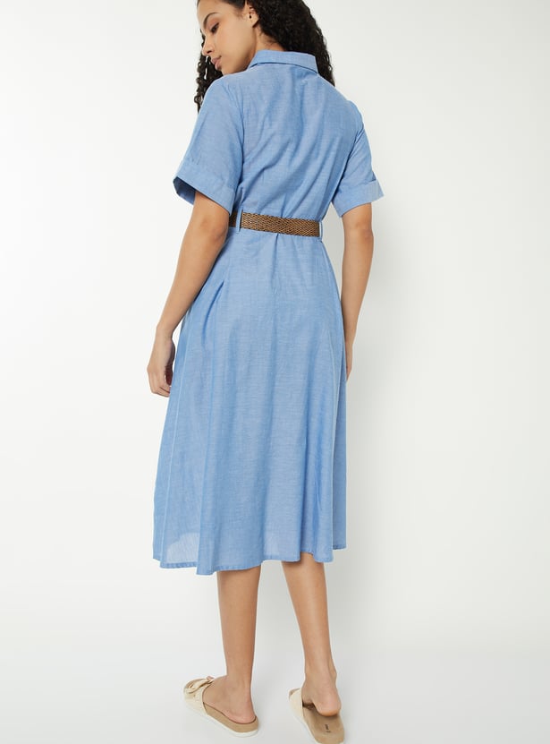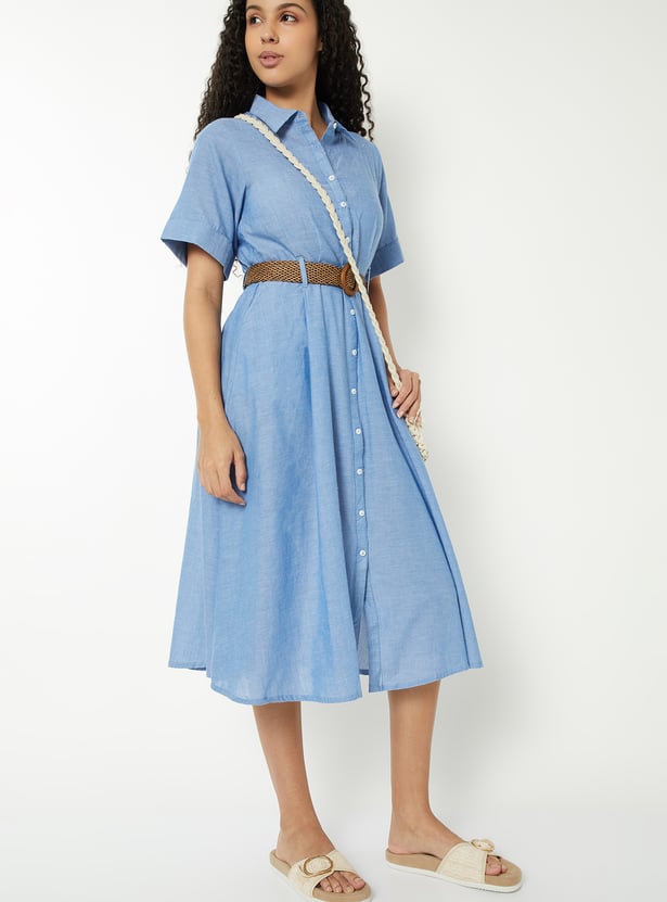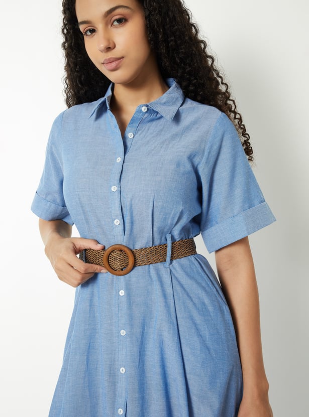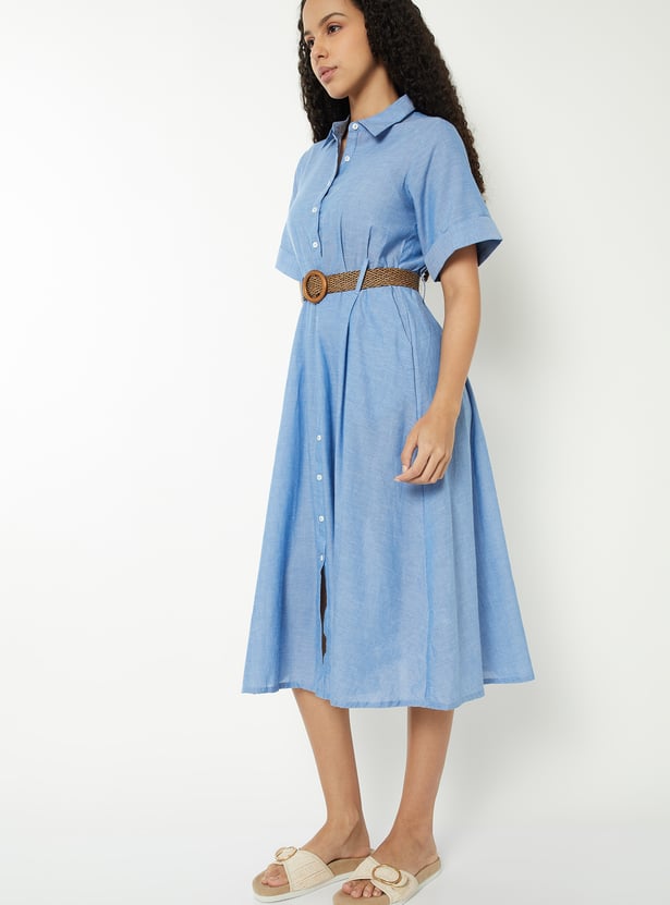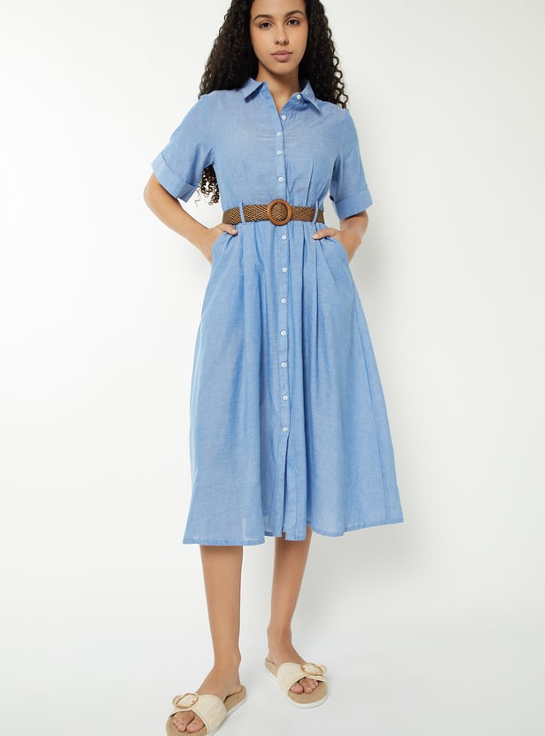 This solid shirt dress features a classic spread collar with a clean button-down placket and a regular fit that feels both crisp and easy. It includes practical side pockets and half sleeves with roll-up tabs for a relaxed, utility-inspired touch.