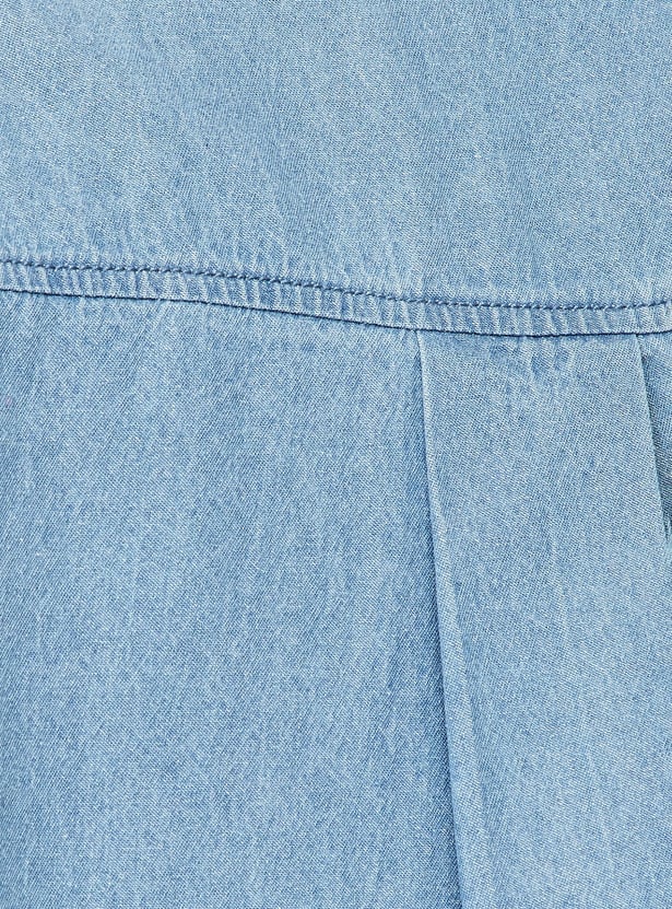 This boxy fit crop denim shirt is a perfect blend of casual and chic, featuring a solid design with a spread collar and button placket. The half sleeves offer a relaxed, breezy fit. Model Size :