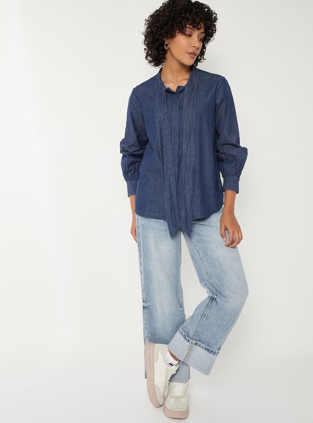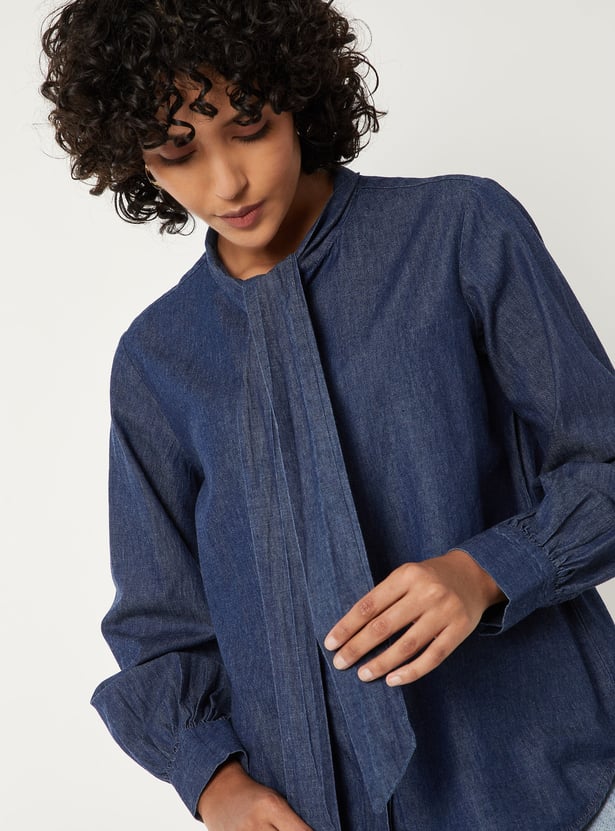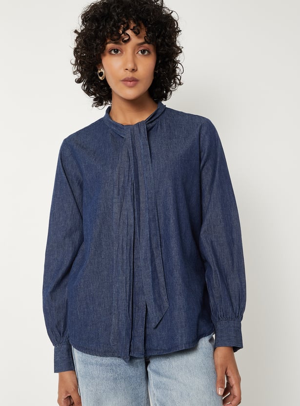 This solid regular fit denim shirt has a tie-up collar, full sleeves with button cuffs, a button placket, and a curved hem.