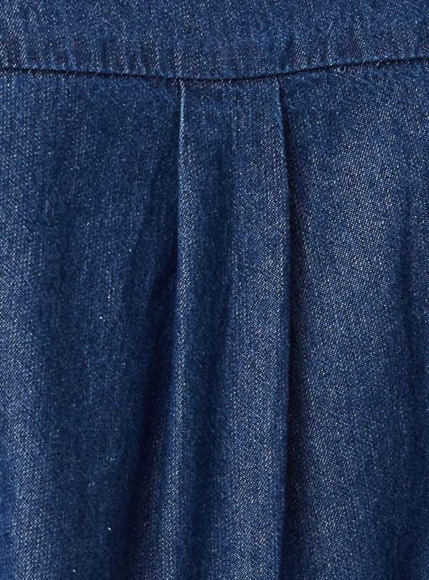 Amp up your fashion quotient in this solid denim dress that features a collared neck with puffed elbow sleeves and a maxi length in a shirt style. Pair it with low-top sneakers for a chic appeal.
