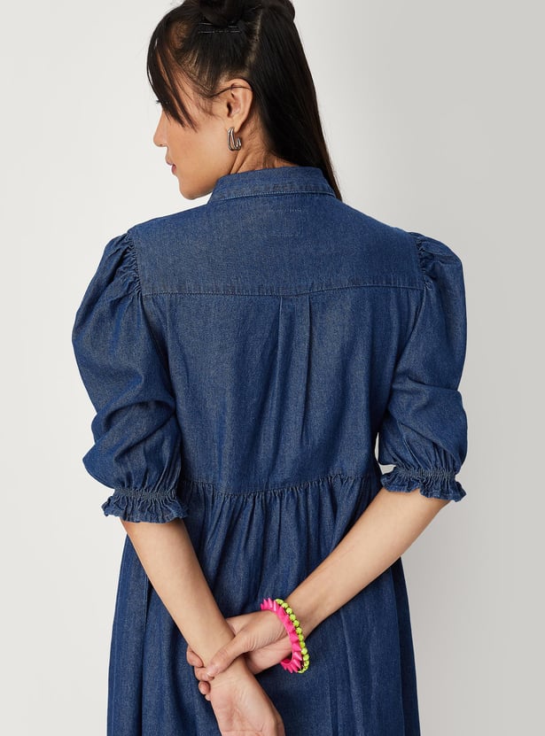 Women Solid Puffed Sleeved Denim Dress