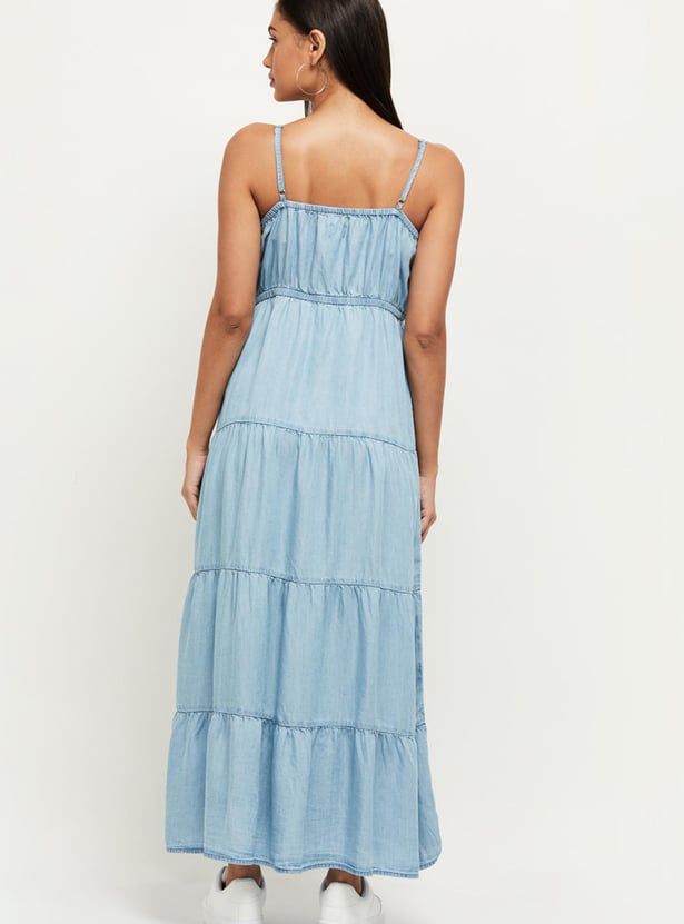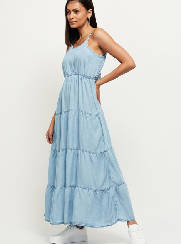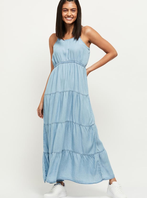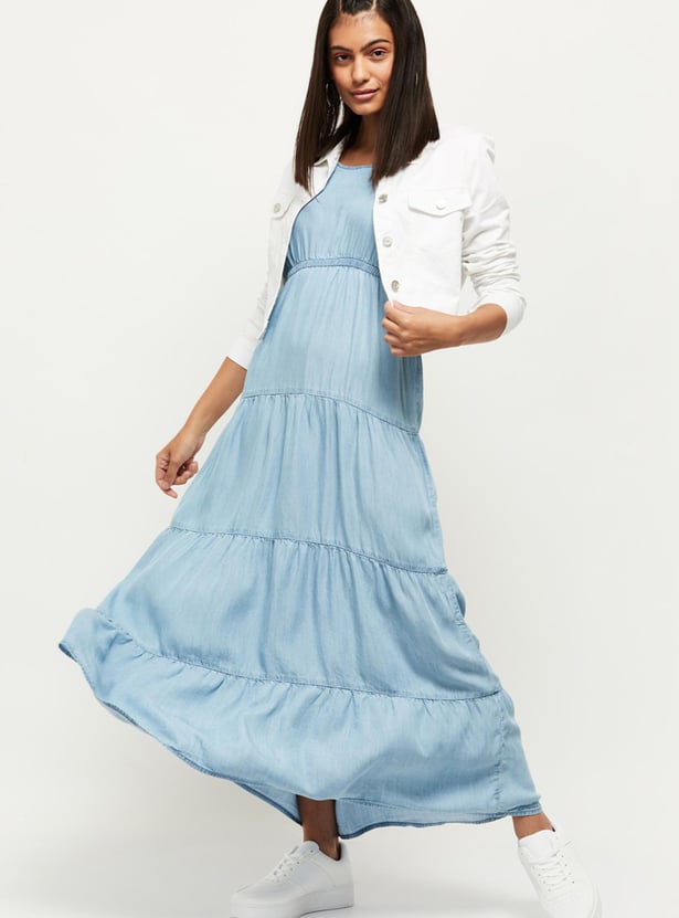 Elegant and comfortable, this solid A-Line dress which has a round neck, shoulder straps, and a maxi silhouette is all you need to ensure your wardrobe is up to date.