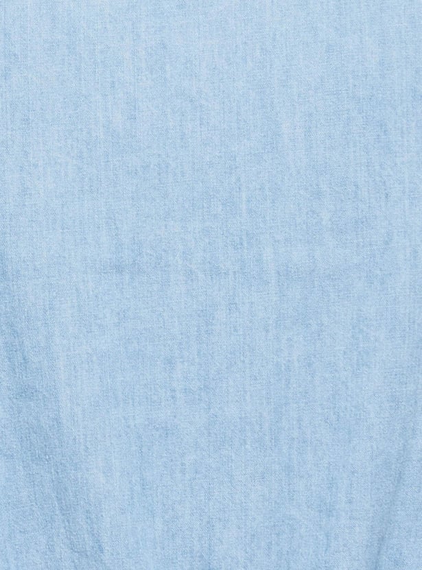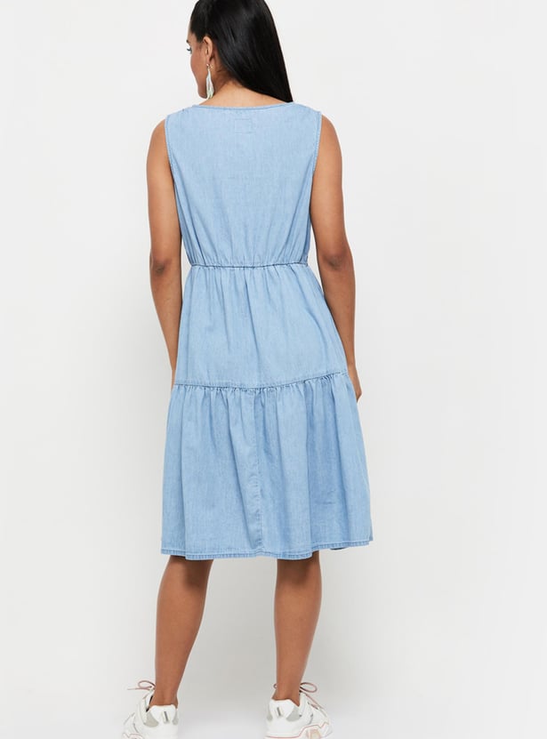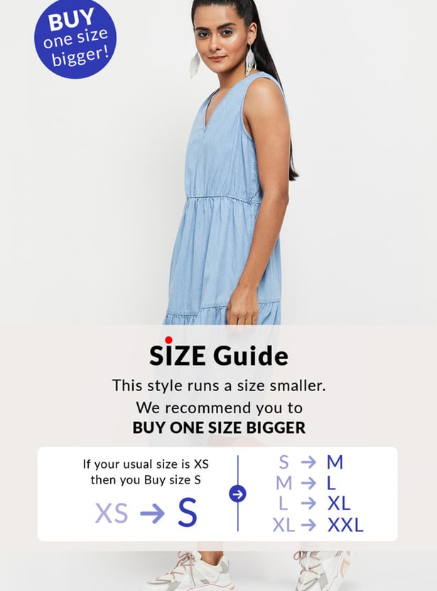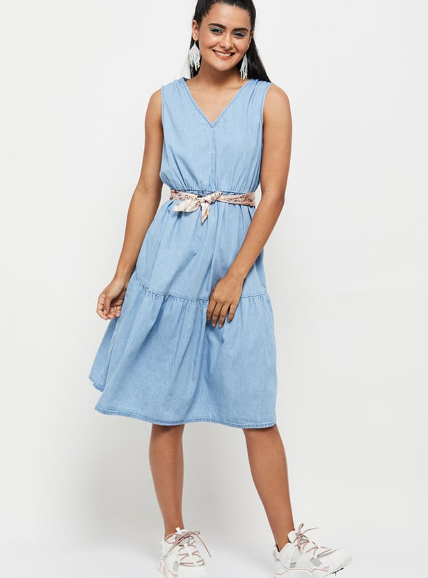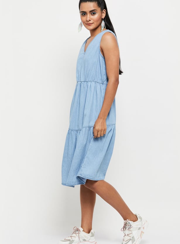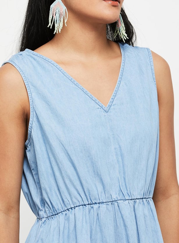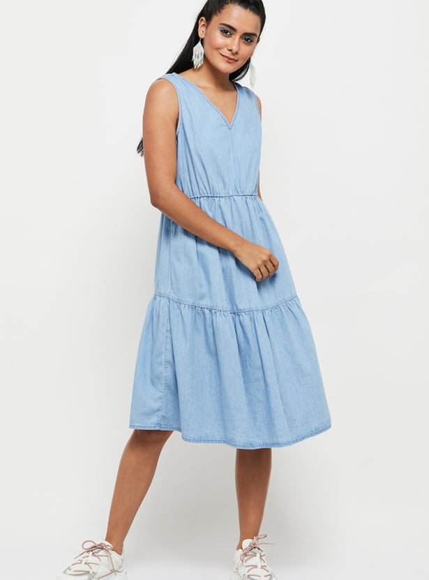 Designed with a solid surface, this denim dress will make you look chic and stylish at the same time. The sleeveless construction, A-line midi silhouette, and V-neck style make it a perfect pick for casual outdoor settings.