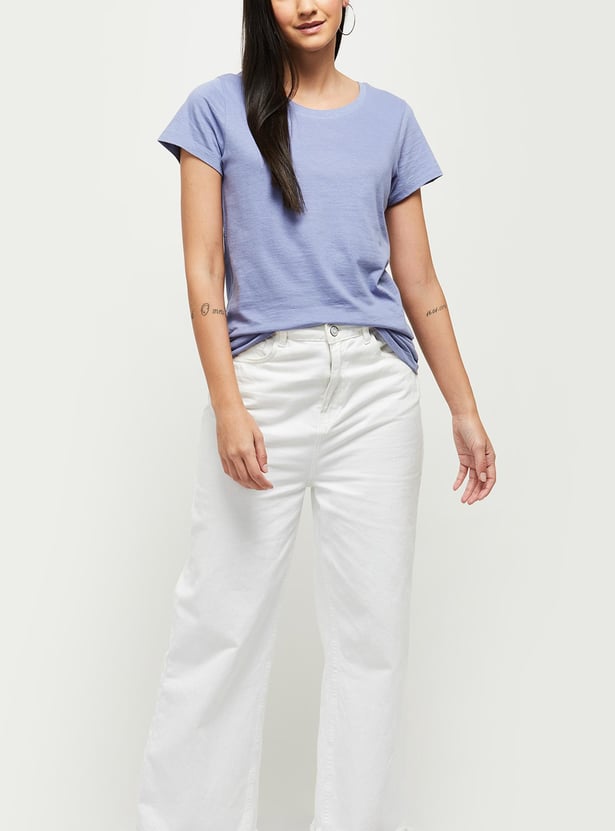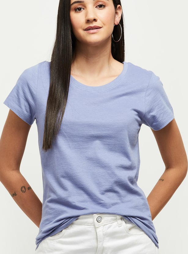 Enrich your casual wardrobe with this fashionable solid t-shirt, which has a round neck and half sleeves.