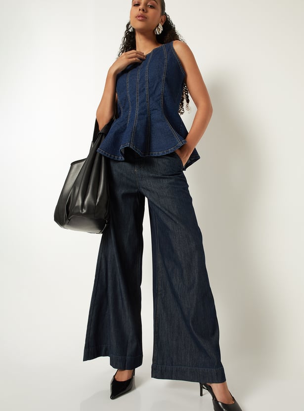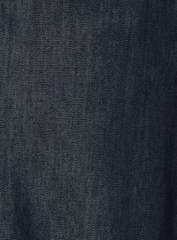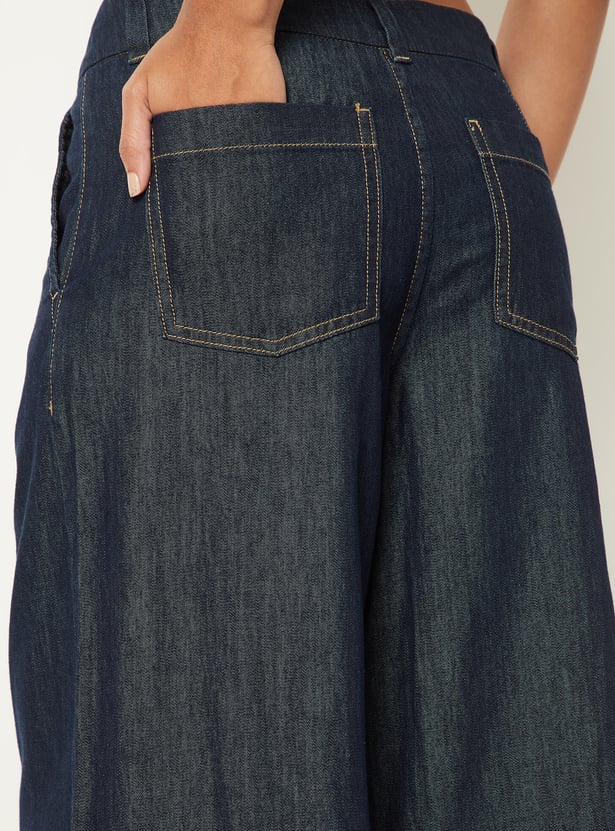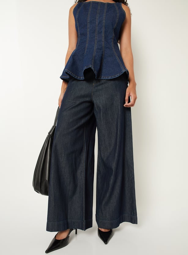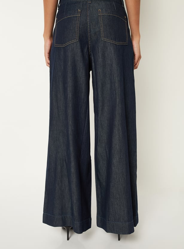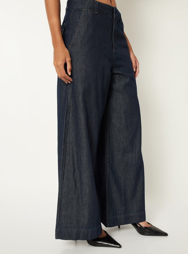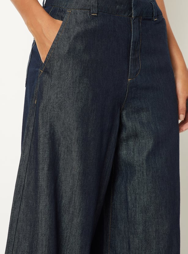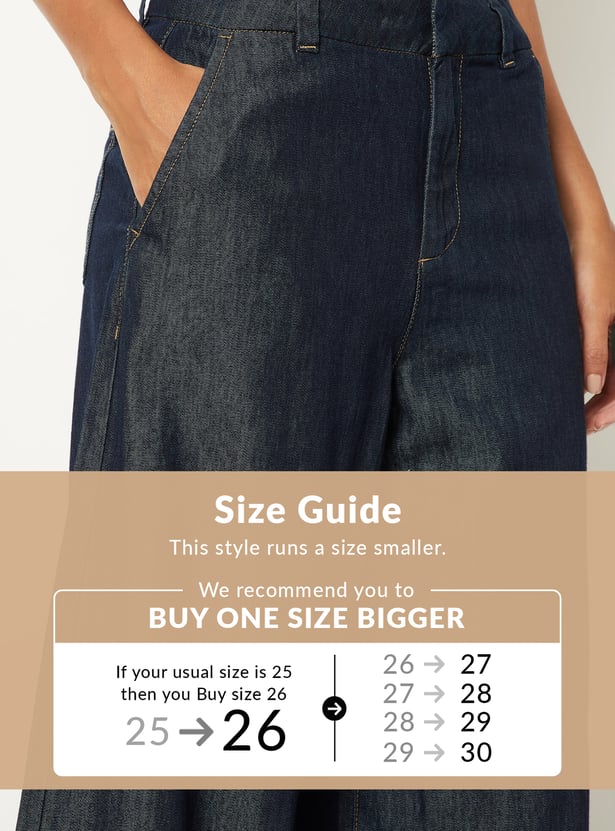 Show off effortless style with this pair of denim trousers. It features a wide leg profile, solid tone finish, and a belt loop waist. The cross pockets add to the functionality.