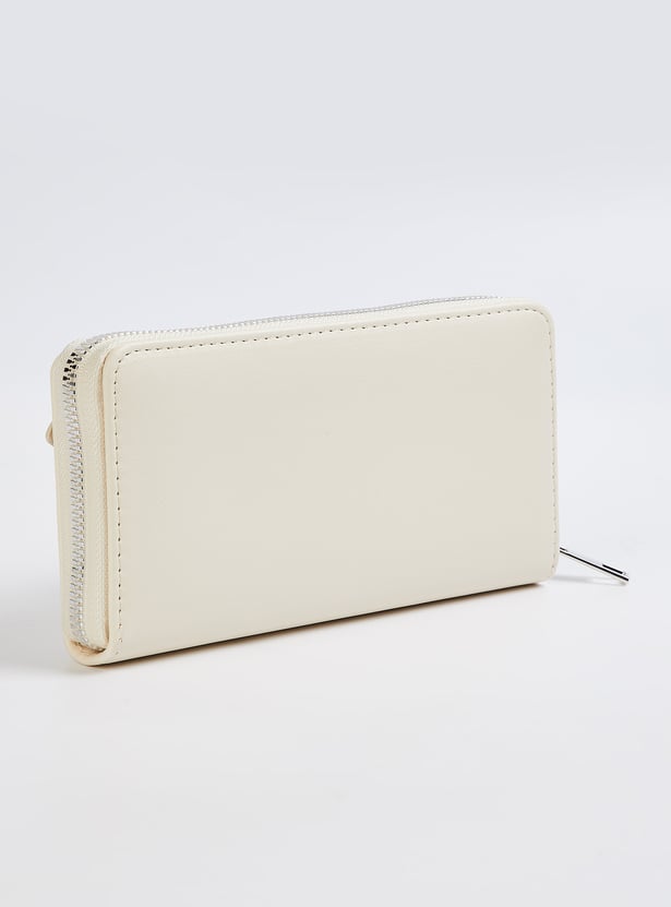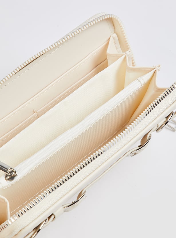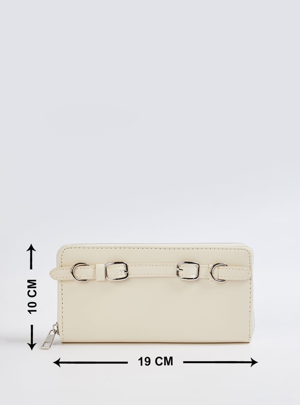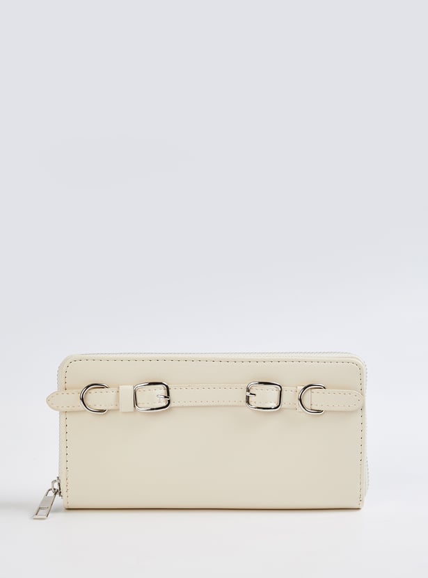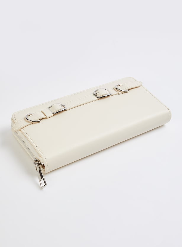 Keep your essentials secure with this solid zip around wallet, detailed with stylish buckles. Features multiple slots for cash and cards, combining function with flair.