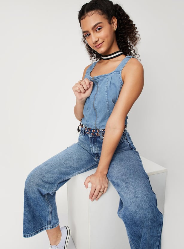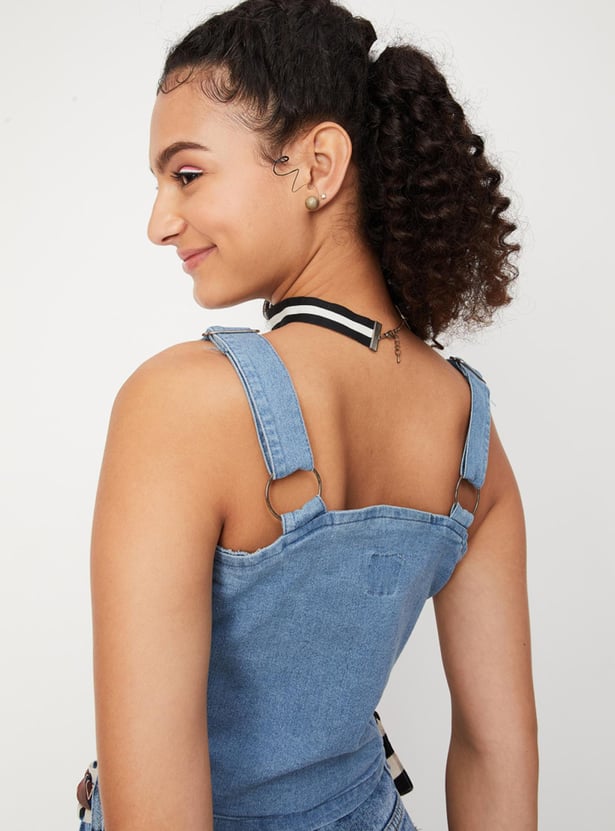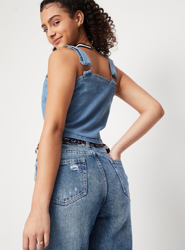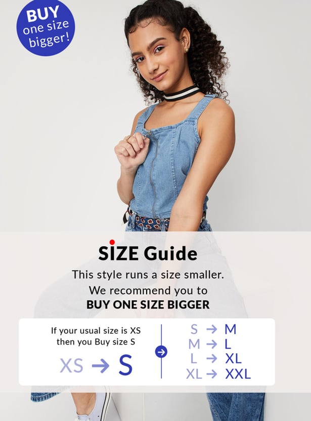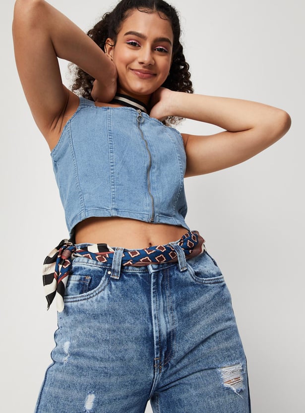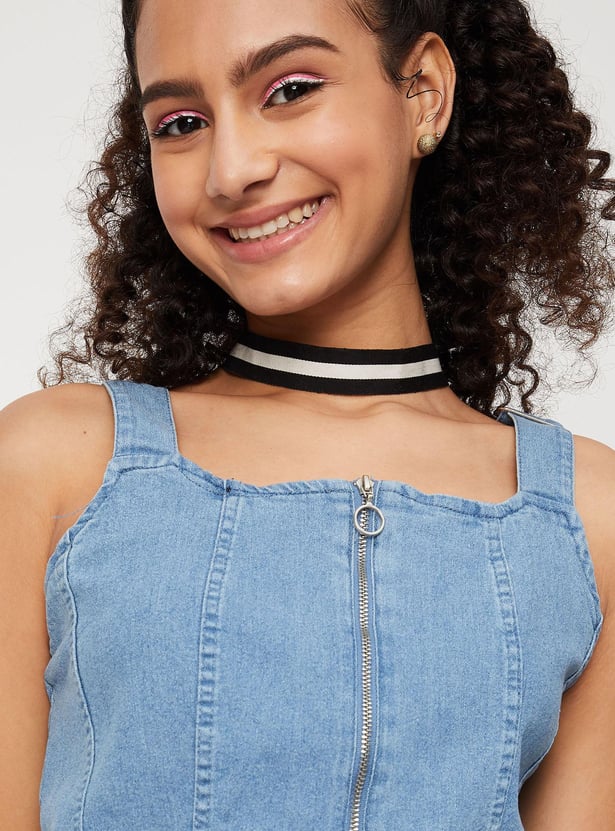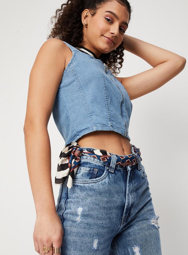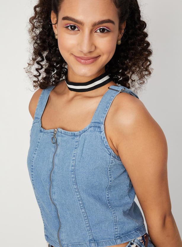 Women Solid Zip Closure Sleeveless Denim Bralette Top
