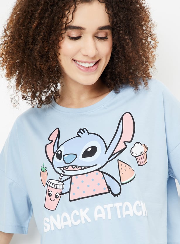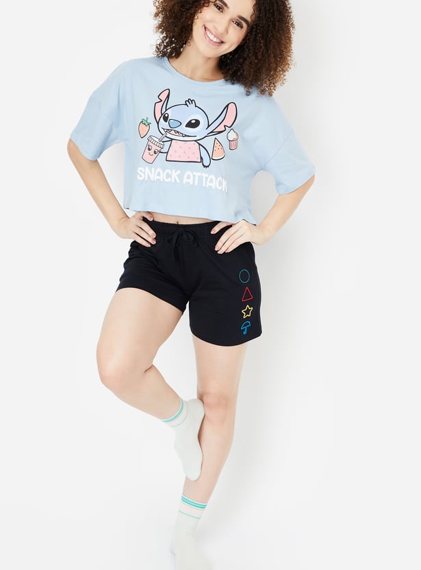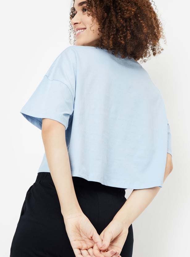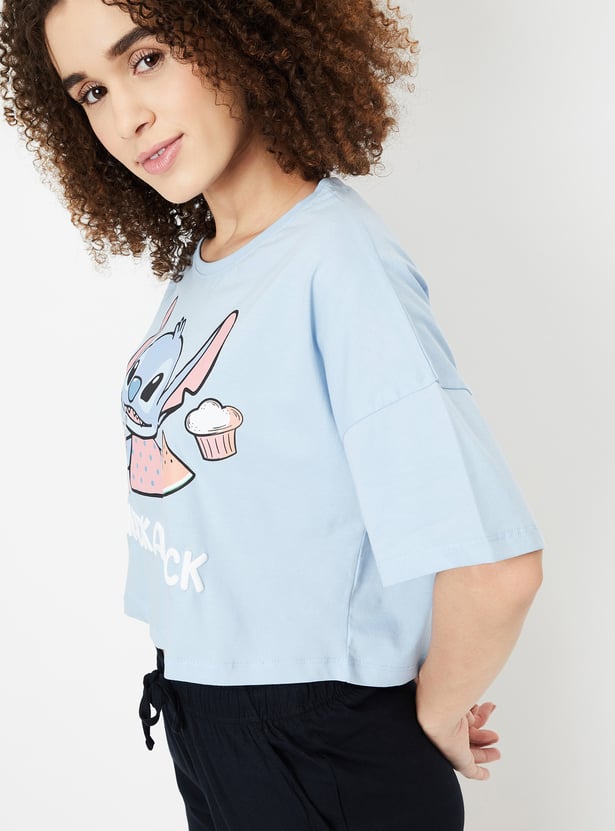 Elevate your loungewear game with this stitch-printed cropped T-shirt. Featuring a round neck and half sleeves, it combines comfort with a trendy silhouette, making it a perfect choice for relaxing in style.